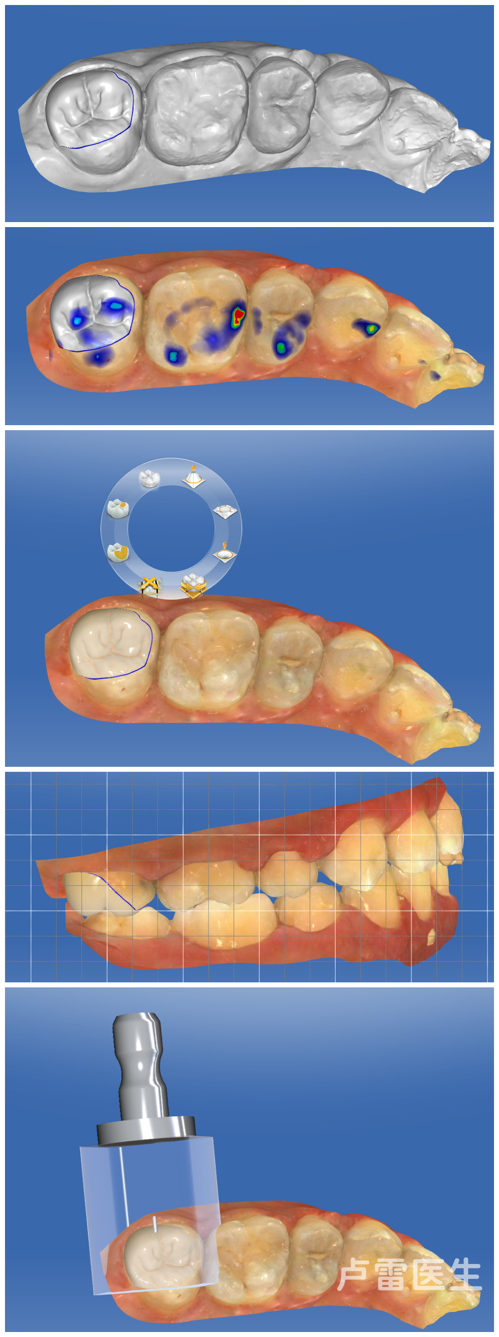 因牙齿龋坏面积大,余留牙壁薄,如再采用补牙治疗方案,后牙的咀嚼压力大,补牙材料强度不够,很容易导致补牙材料崩裂,甚至牙齿崩裂。为了避免牙齿和补牙材料崩裂,采用数字全瓷嵌体修复。下面是牙齿处理过程前后对比。
