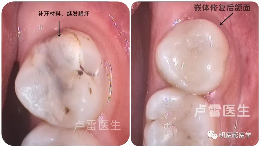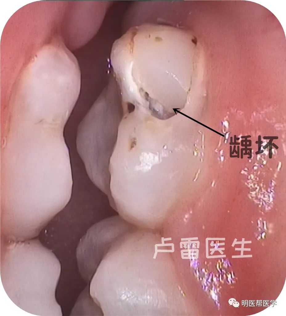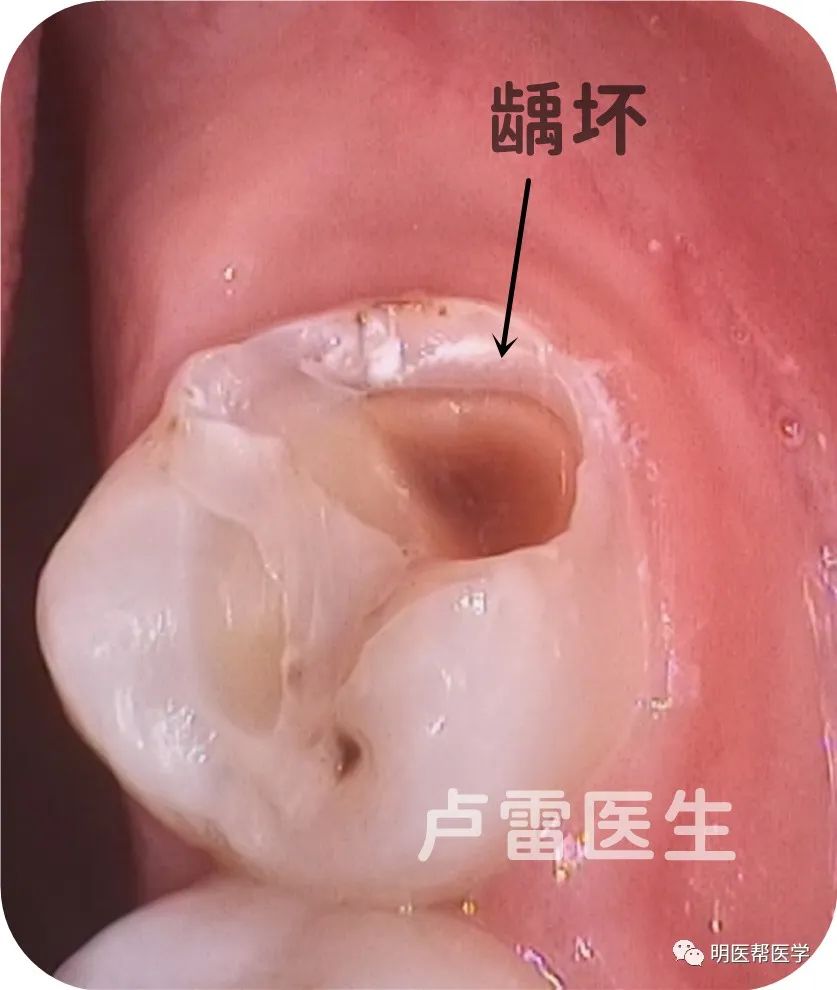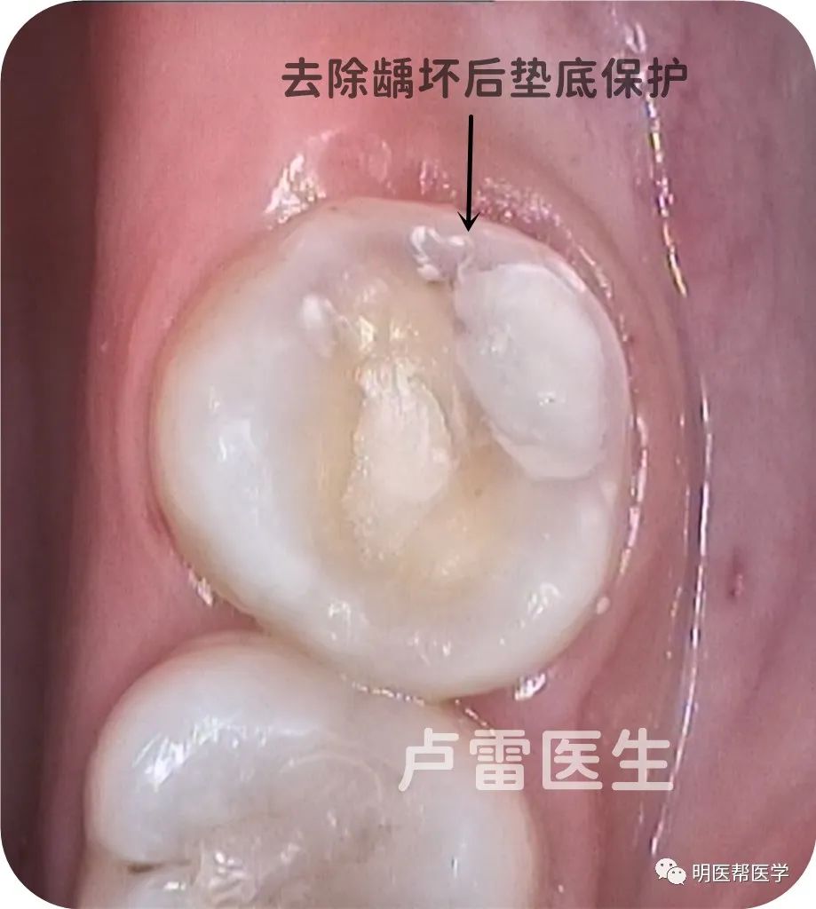 牙齿补牙后补牙材料老化、崩裂,出现继发龋坏,去除补牙材料发现补牙材料下方有大面积龋坏,龋洞深。