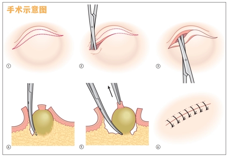 手术是皮脂腺囊肿唯一的治疗方法。手术中可在与囊肿相连的皮肤,尤其是见到导管开口时,沿着皮纹方向设计梭形的皮肤切口,连同囊肿一起摘除。分离时应特别小心,囊壁很薄,应当尽量完整地摘除。如果残留囊壁,则易于复发。如果术前有红肿热痛等炎症表现时,应首先控制炎症,后期再安排手术。
