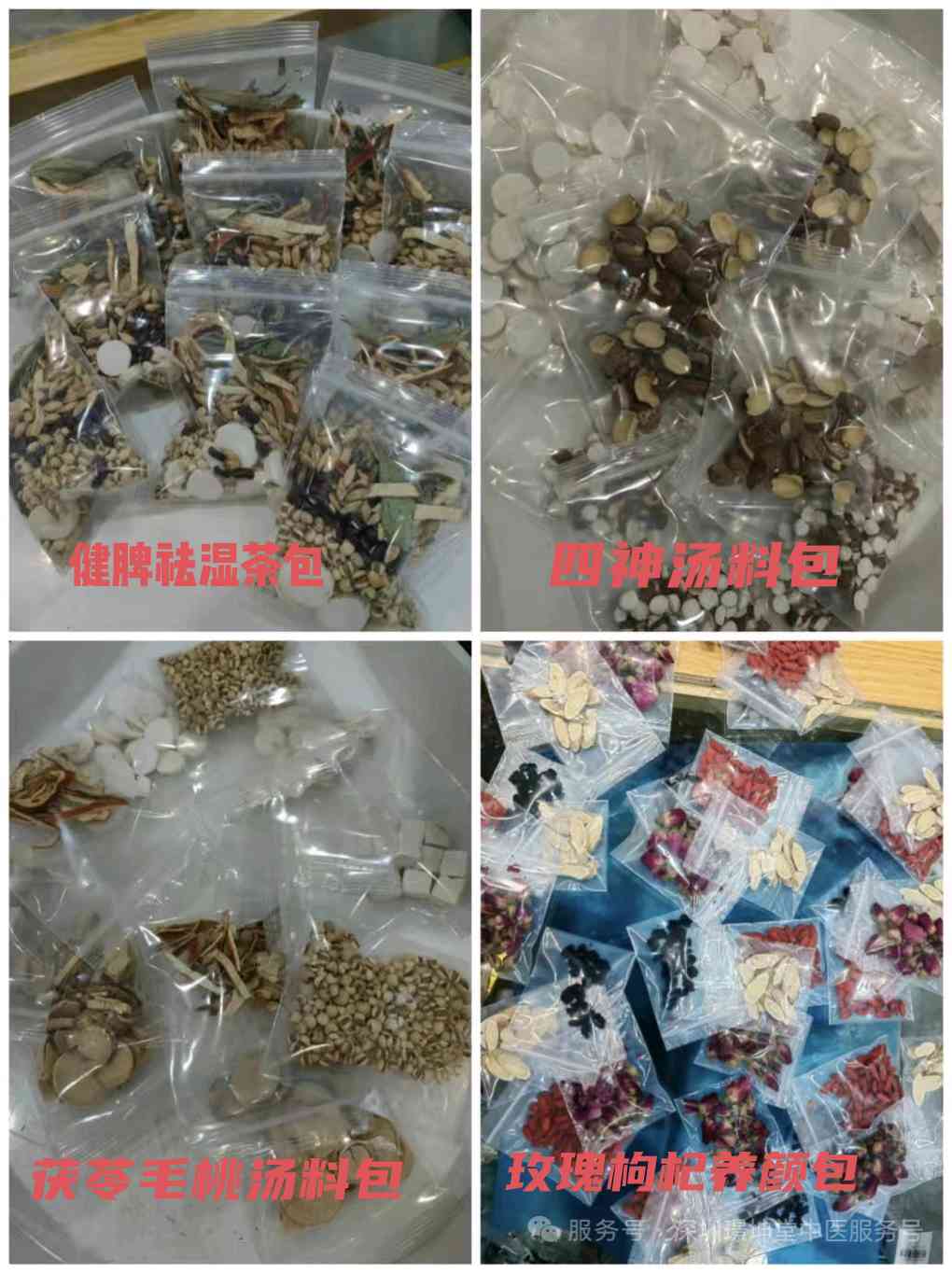 各类药剂包:汤料包~归芪桂圆汤料包、四神汤料包、健脾安神包;泡脚包—温阳散寒包、健脾祛湿包;艾灸补阳~雷火灸、督脉灸、穴位贴、温针灸等。