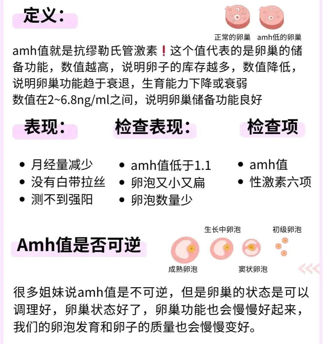 如果你也被这些问题戳中,先别慌!对于 35 + 的女生来说,AMH(抗缪勒氏管激素)就像卵巢的 “体检报告”,一眼能看出卵子储备够不够。一般这个年纪,AMH 在 1.5-2.0ng/mL 才算 “合格线”,要是跌破 1.1ng/mL,确实得给卵巢提个醒 —— 但这绝不是 “没救了” 的信号!
