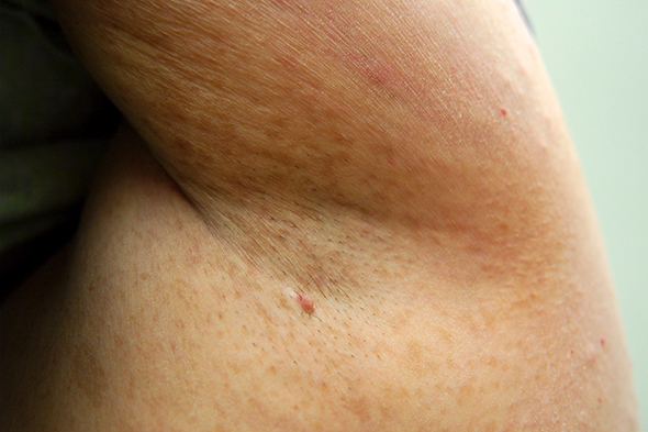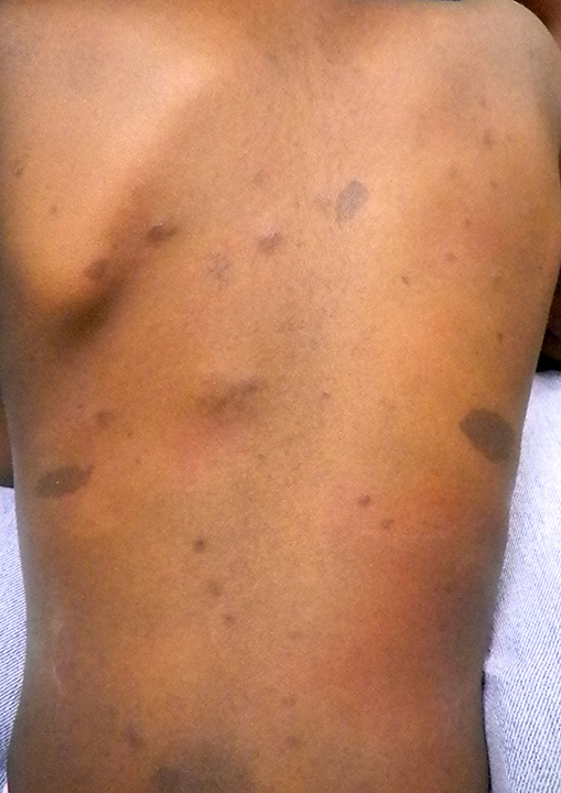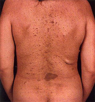 边界光滑的浅棕色斑块(直径>5mm),类似“咖啡加牛奶”的颜色,90%患儿在1岁前出现。斑块不痛不痒,常被误认为胎记。