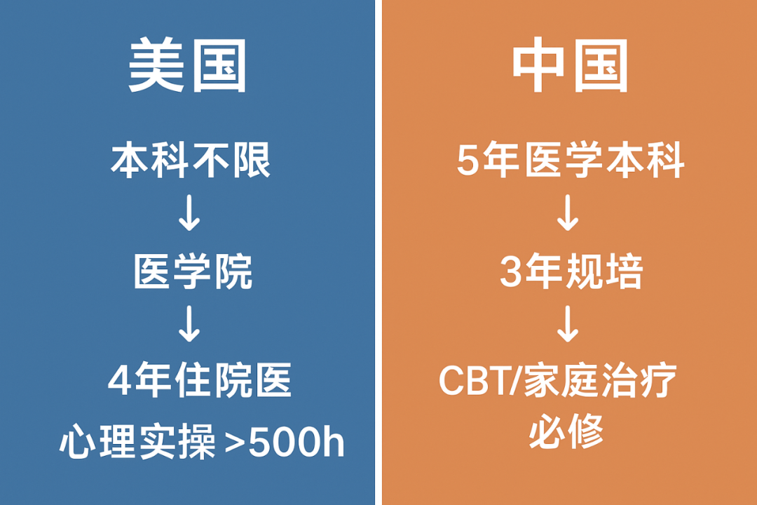 本科专业不限,修完医学预科 → 医学院4年 → 精神科住院医4年。