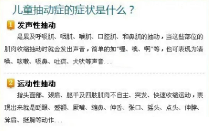 抽动症又称为抽动秽语综合症。抽动症多于童年起病,慢性病程,由“爆破状”不自主发声,包括秽语及多发性抽动等特点所组成的综合征候群。