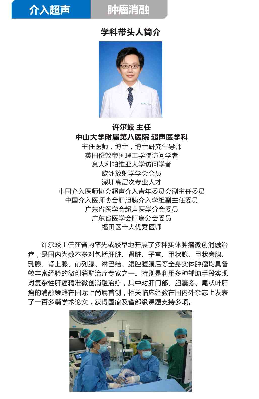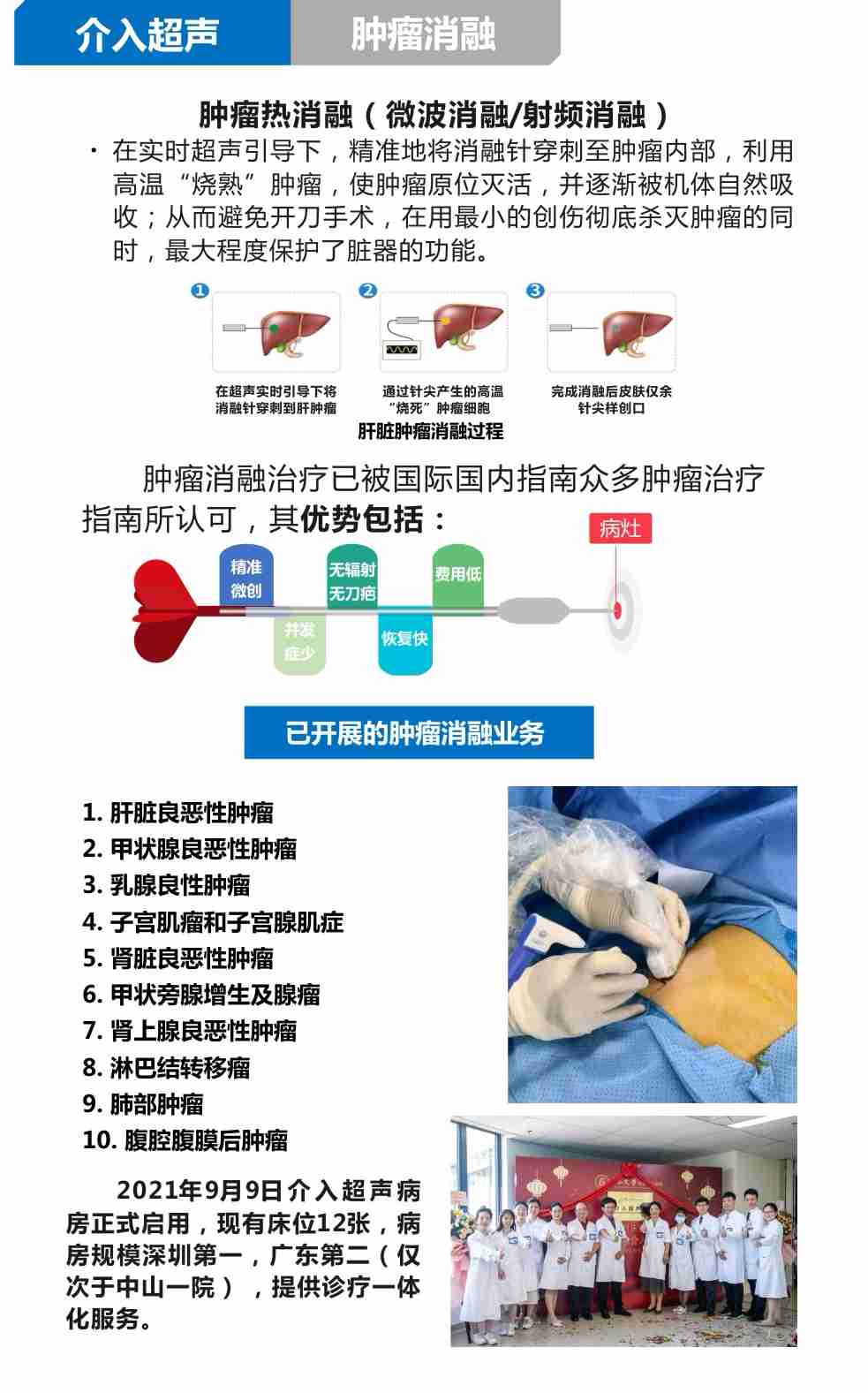 中山大学附属第八医院介入超声病房于2021年9月9日正式启用,现阶段设立独立病床12张,位于三号楼15楼,规模居深圳第一,全省第二,可以开展全身肿瘤的介入超声诊断和治疗,诊疗水平达到省内先进水平!全体医务人员全心全意为患者提供微创、精准、高效的诊疗服务!