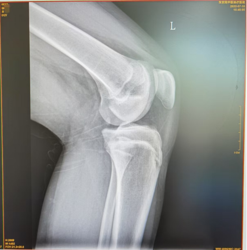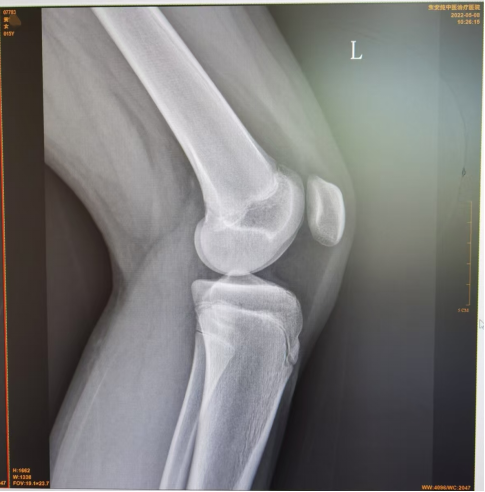 图1可见胫骨结节处无明显损伤,图2可见胫骨结节前缘舌状下缘少许分离,图3可见胫骨结节前缘舌状下缘明显分离且向前凸起。