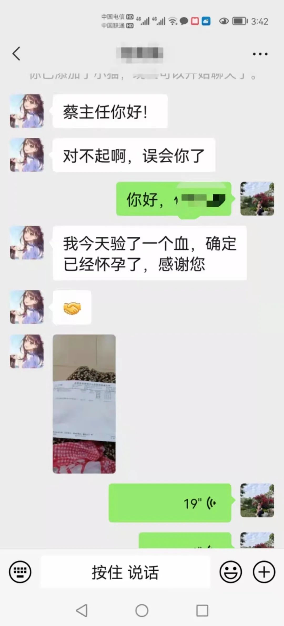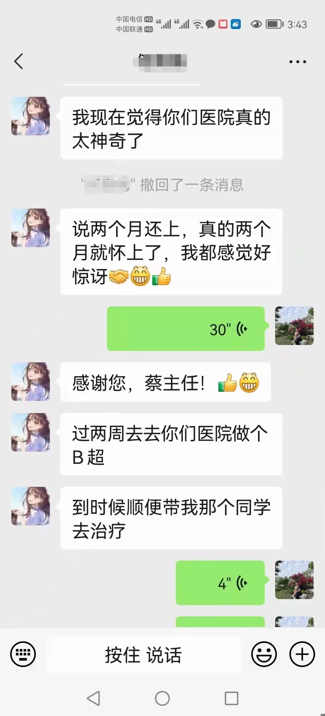 手术后,蔡主任从别人的口中了解到何女士术后感到不适,本想着发消息询问并向其了解详细情况,却发现自己的微信被对方拉黑,通过一通电话得知何女士对我院的手术产生质疑,表示要在外院进行检查并观察。直到2022年5月5日,何女士在外院查血显示自己已经怀孕一个多月,她才知道自己对蔡主任产生了误会。重新添加微信后,她对蔡主任表示抱歉,并表示家人和同学知道消息后都替自己感到高兴。何女士的同学今年38岁,和她有着一样的烦恼,对蔡主任产生特有的信任后,她准备带着自己的同学来院检查并治疗。