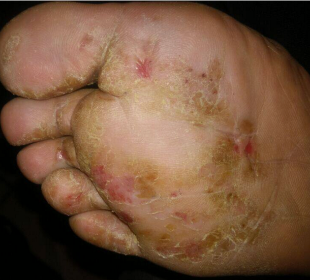 水疱主要出现在趾腹、趾缝,最常见于三四趾间,足底亦可出现,为深在性小水疱,可逐渐融合成大疱。