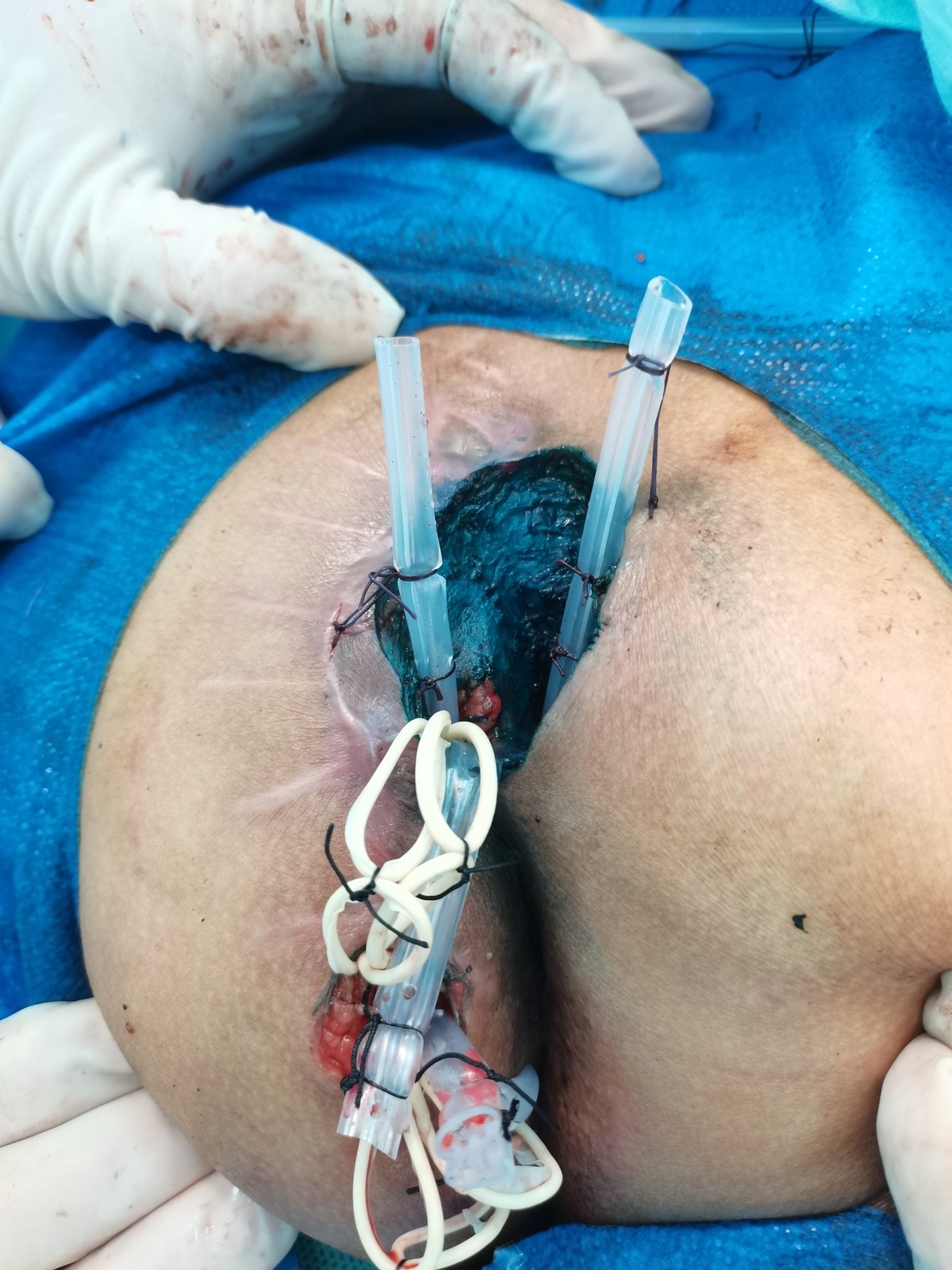 50岁男性患者,半年前在某三甲医院做的骶尾部藏毛窦囊肿手术,术后伤口未完全愈合,骶尾部伤口中间一直有一个直径约0.5cm的破口,反复破溃流脓,一直无法愈合。在我这里住院检查后,2月28日术中探查发现破溃口处的瘘管一直深达低估前方,另有分支通往左侧肛周,9点处两条分支深达左侧坐骨直肠窝,从折刀位12点-6点,反复探查瘘管,未能发现明确内口,可吸收线缝合9点疑似内口处粘膜,各个分支瘘管充分留置引流管,彻底清楚瘘管坏死组织,诊断考虑肛周脓肿和肛瘘。术后患者控便功能好,继续观察和伤口换药,间断拆除引流管,希望伤口能彻底愈合。