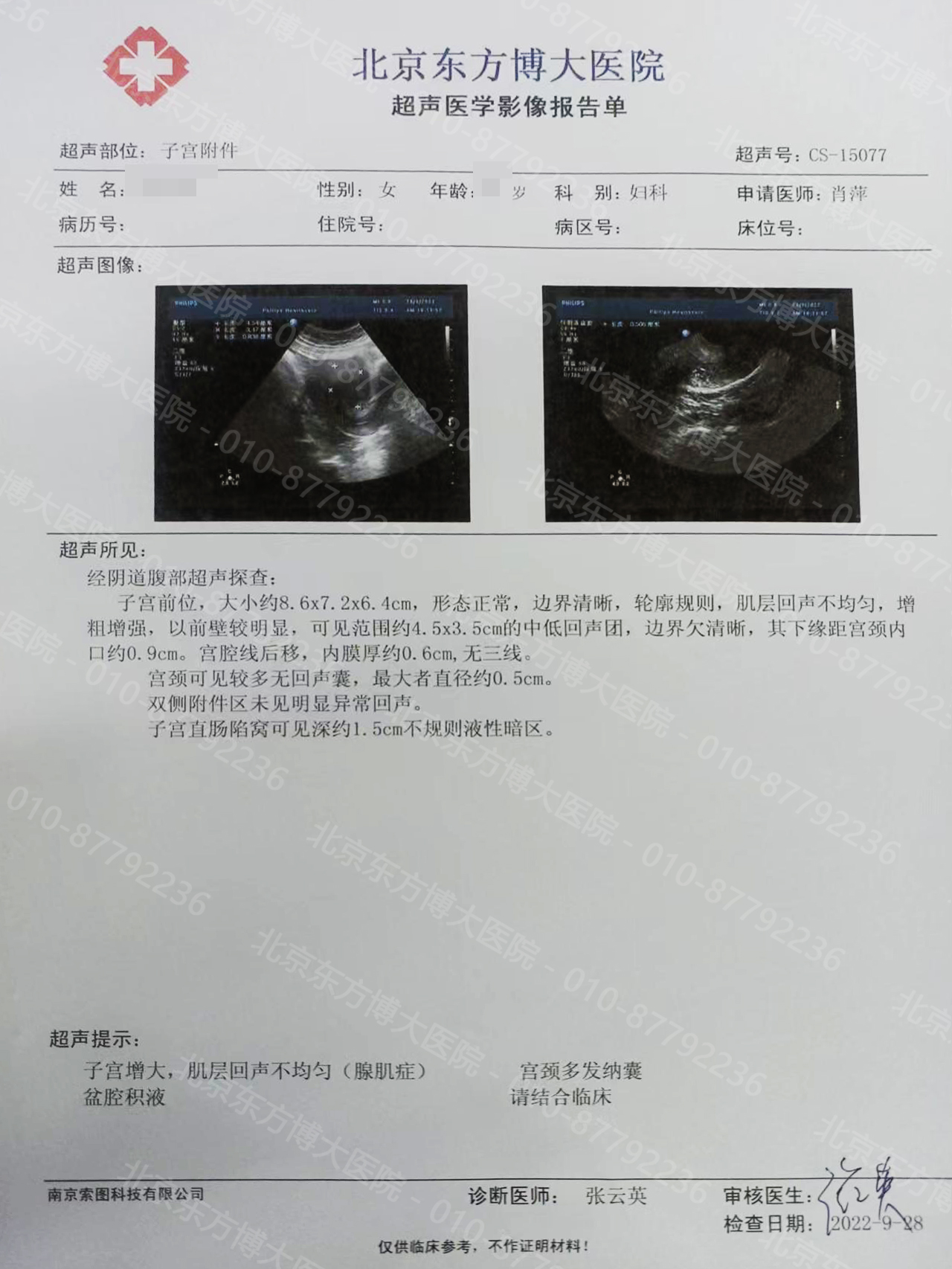 9月28日就诊我院,B超提示子宫肌层回声欠均匀,增粗增强,以宫底后壁较明显,可见范围约4.5x3.5cm的中低回声团,门诊以“子宫腺肌病”收入院。