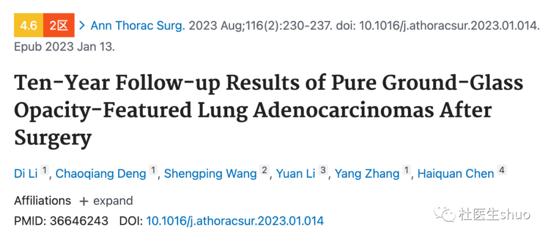 结合术前影像学检查来看,如果术前CT是纯磨玻璃结节,有一篇2023年发表在《Ann Thorac Surg》的研究,题目为《纯磨玻璃样腺癌手术后10年随访结果》。