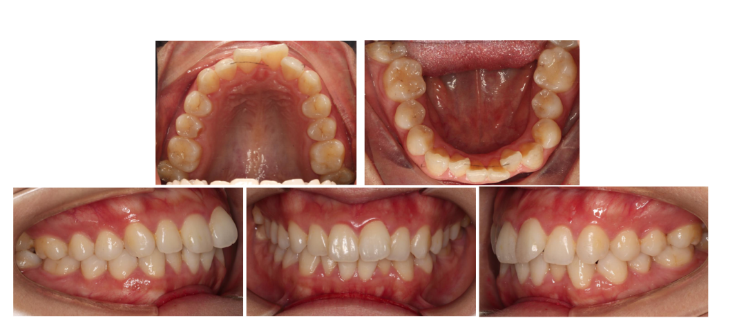 如图1-3⼝内情况所示:上下前牙轻度拥挤、上前牙唇倾、牙弓形态尚可。