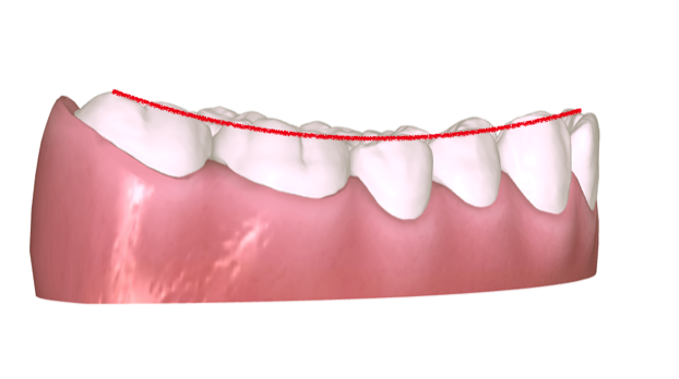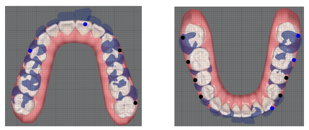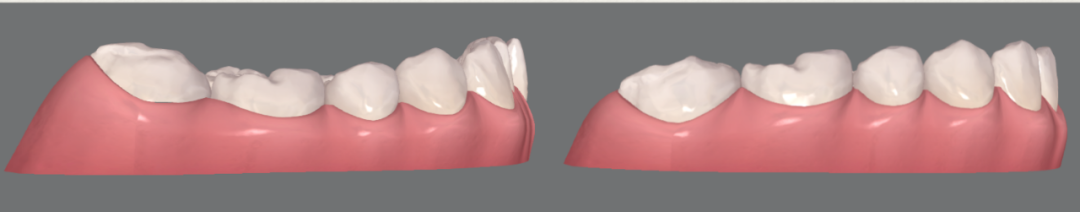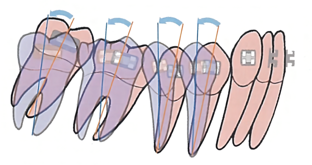 上下颌后牙远中直立(如图1-8所示)(远中直立相比较磨牙整体远移更加节省支抗)。为了保护前牙支抗、增加患者佩戴矫治器信⼼,选择少量多轮移动先排齐前牙再内收原则,尽量减少双推(同⼀象限内两颗牙同时远移),矫治中观察前牙支抗、为了抵消推磨牙向后产⽣的反作用⼒前牙要设计强支抗(上下四个象限颌骨钉植⼊或者使用间接支抗的⽅式)。