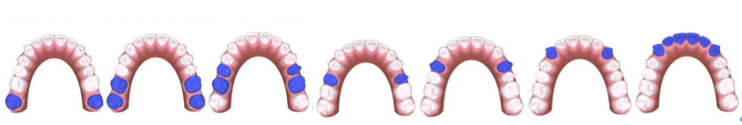 ⽮状向:前牙先以12为基准排齐再内收2 ㎜,通过磨牙远移+前牙3~3不超0.3㎜ IPR获得间隙,前牙内收过程当中参考11保持转矩内收。下前牙内收过程当中保持转矩内收(参考41)、前牙正常覆盖结束。移动序列使用改良V-PATTERN’序列(如图1-9所示)每轮2㎜,前磨牙分开移动,5移动到位之后再移动4,均分⽮状向远移量, 后牙在远移过程当中增加冠远中轴倾角度,以根尖点为旋转中⼼(如图1-10所示)