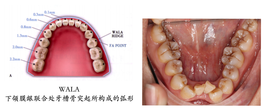 上下颌初始与终末位置重叠。上颌以21为基准内收6㎜(如图1-11所示),下颌以31为基准内收3㎜(如图1-12所示)。内收过程当中要时刻关注前牙支抗(是否出现前牙唇倾)要根据前牙支抗情况,选择不同⼒值的皮筋牵引,需要注意的是,合理的移动序列比支抗钉更加重要。关注前牙支抗的同时也要关注后牙段,防⽌已经推到位的磨牙出现近中移动,有效的⽅法是在已经到位的磨牙制作TPA或使用间接支抗(如图1-12所示)。垂直向:该患者为均角,设计为通过伸长前磨牙压低后牙与下前牙整平下颌SPEE曲线,前牙正常覆合结束。SPEE曲线整平⽅式:对于⾼角患者、后部HE平面较陡的SPEE曲线主要通过压低后牙的⽅式整平。均角患者设计压低后牙与下前牙,伸长前磨牙的⽅式整平,低角患者希望更多通过升⾼后牙的⽅式整平SPEE曲线。⽔平向:以16、26为基准,不设计扩弓调整上下颌牙弓宽度。第⼀:参考Wala嵴(如图1-14所示),看颊侧是否有⾜够的骨量,通过测量FA点与 Wala Radge 的距离或参考CBCT进⾏判断)、磨牙的转矩(如图1-14所示),可以在电⼦扫描模型中的后视图当中进⾏观察(如图1-15)。后牙舌倾是扩弓的有利条件。如果磨牙已经是颊倾的状态,则不建议再设计扩弓,可在处⽅表当中向技师表明“以 16、26横向宽度为基准,维持现在的磨牙牙弓宽度”。
