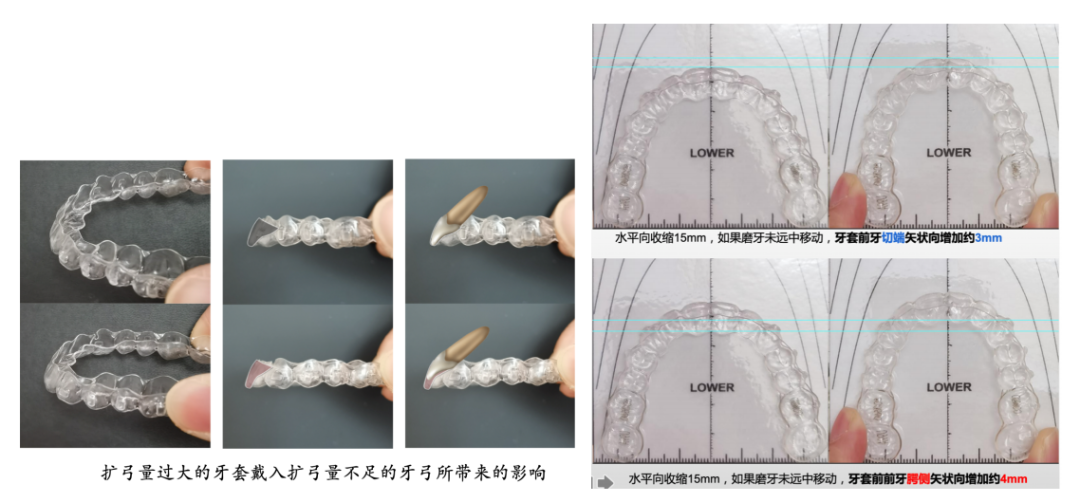 第⼆:正面微笑审美(如图1-16、1-17所示)。患者对颊廊的要求,微笑时⼝角处的⿊⾊间隙较⼤会显的微笑不够饱满,显露更多的后牙及颊间隙稍小时微笑会更加美观。扩弓量设计过⼤所带来的影响在设计扩弓时候要考虑到患者基骨的条件,颊侧骨量、磨牙转矩及患者对颊廊的个性化要求。如果矫治⽅案设计过量的扩弓,但在临床实际当中未实现,过宽的牙套戴⼊窄于矫治器的牙弓,会持续对前牙施加挤压的⼒量,导致前牙唇倾、脱套图(如1-18、图1-19所示)。