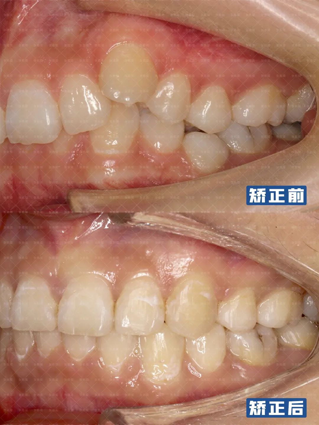 仔细检查女士口内情况发现,III度深覆合,上颌II度拥挤,下颌III度拥挤,露龈笑,嘴巴稍微有点凸。