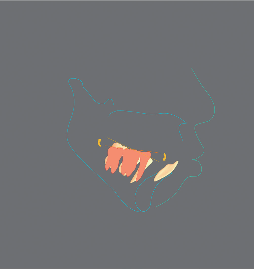 (2)增强下颌后牙支抗,排齐下前牙的同时打开咬合。(3)促进下颌前伸,改善下颌颏部形态的关键是充分直立内收下前牙。下颌种植支抗同时压低下颌后部颌平面。(4)随着下前牙直立内收,下颌自动前伸,下颌颏部形态改善明显。