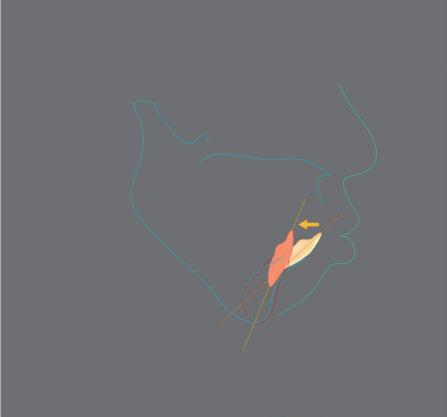 2、下前牙充分直立内收(非控制性倾斜移动),确保下前牙直立于基骨。
