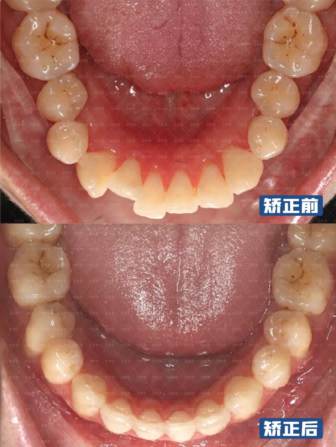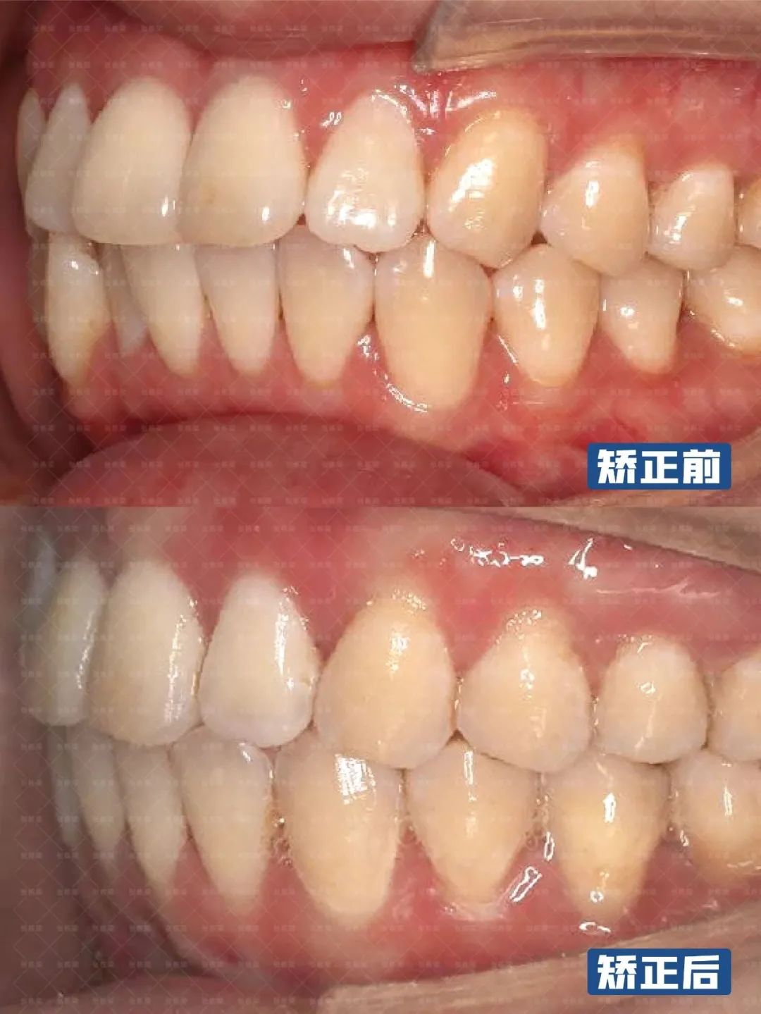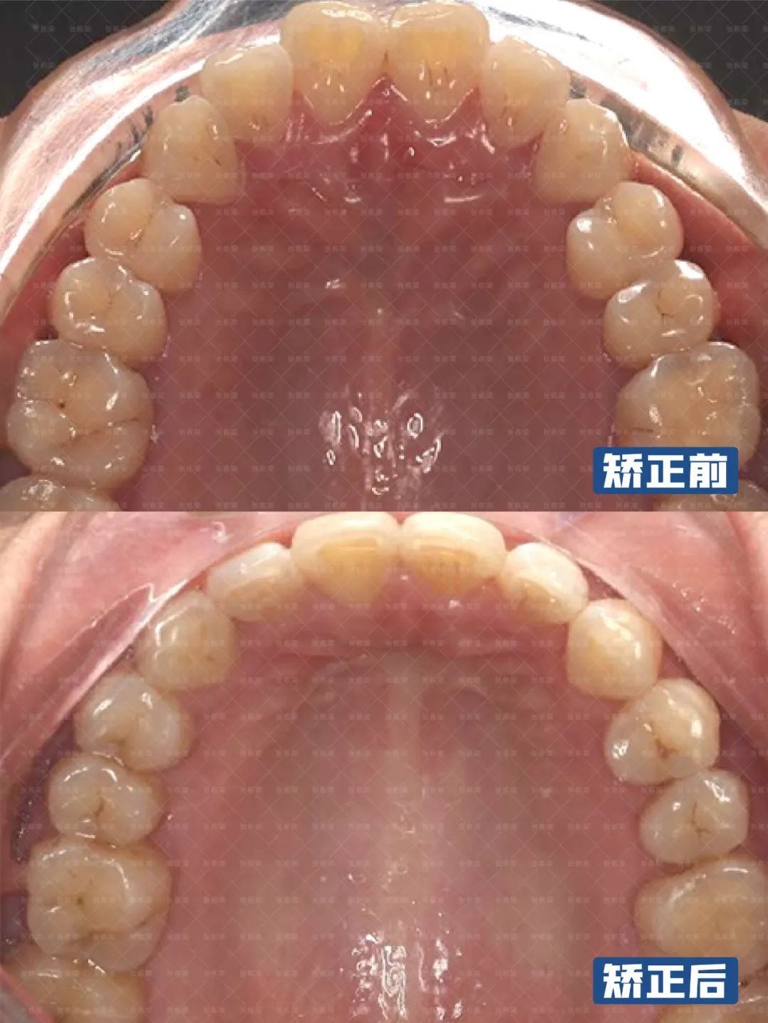 整个牙齿矫正过程,女士配合良好,矫治结束可见上牙转矩角度正常,下前牙排齐,上颌内收,颏部前伸,全牙列咬合建立达到预期目标要求。