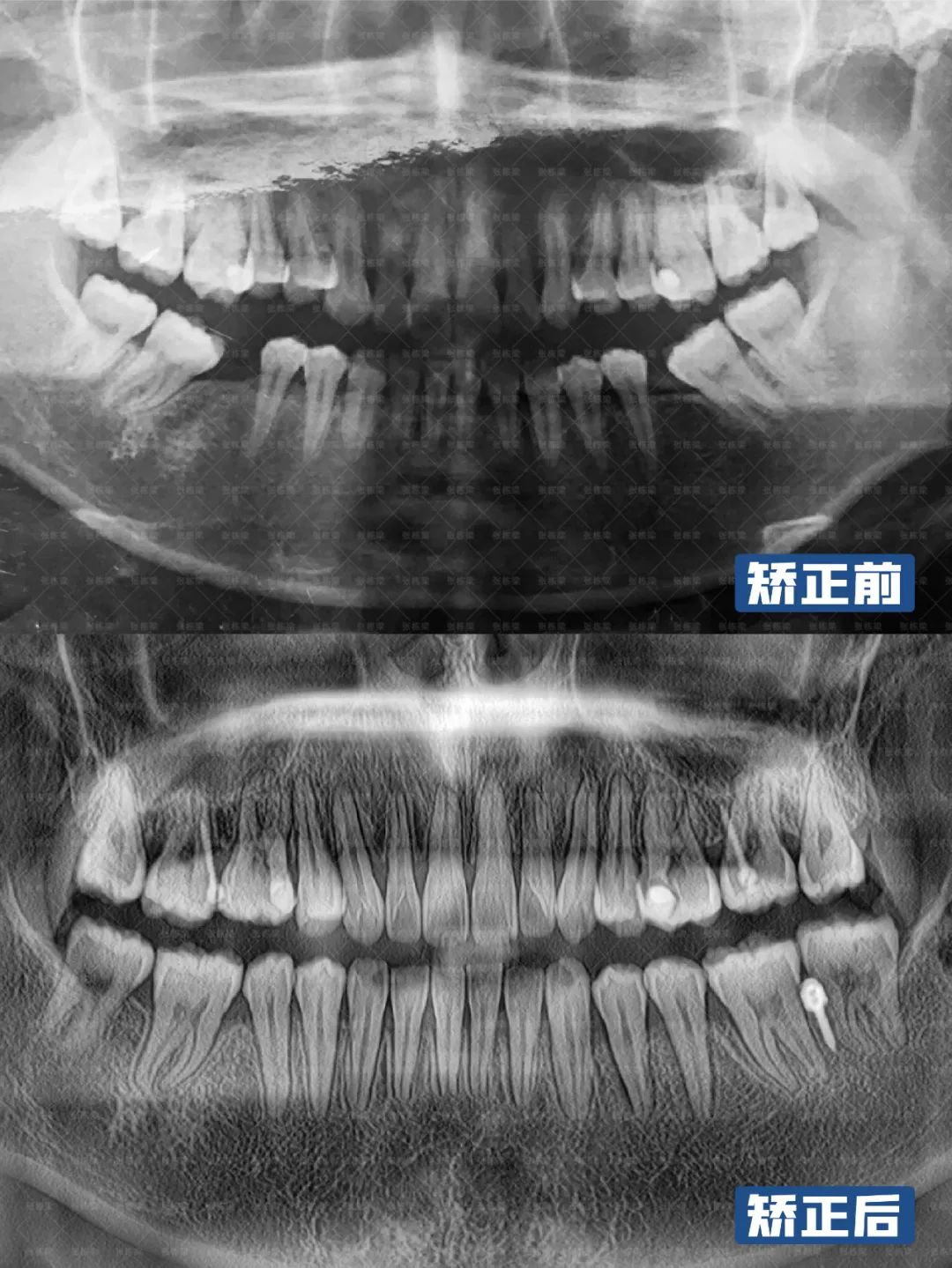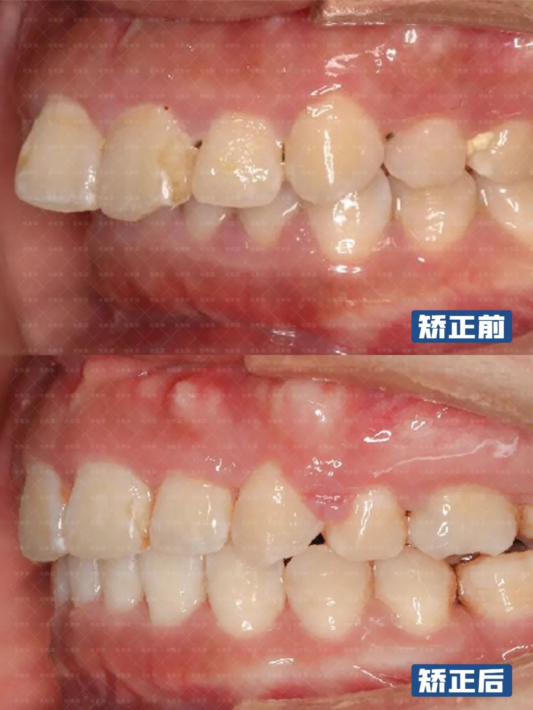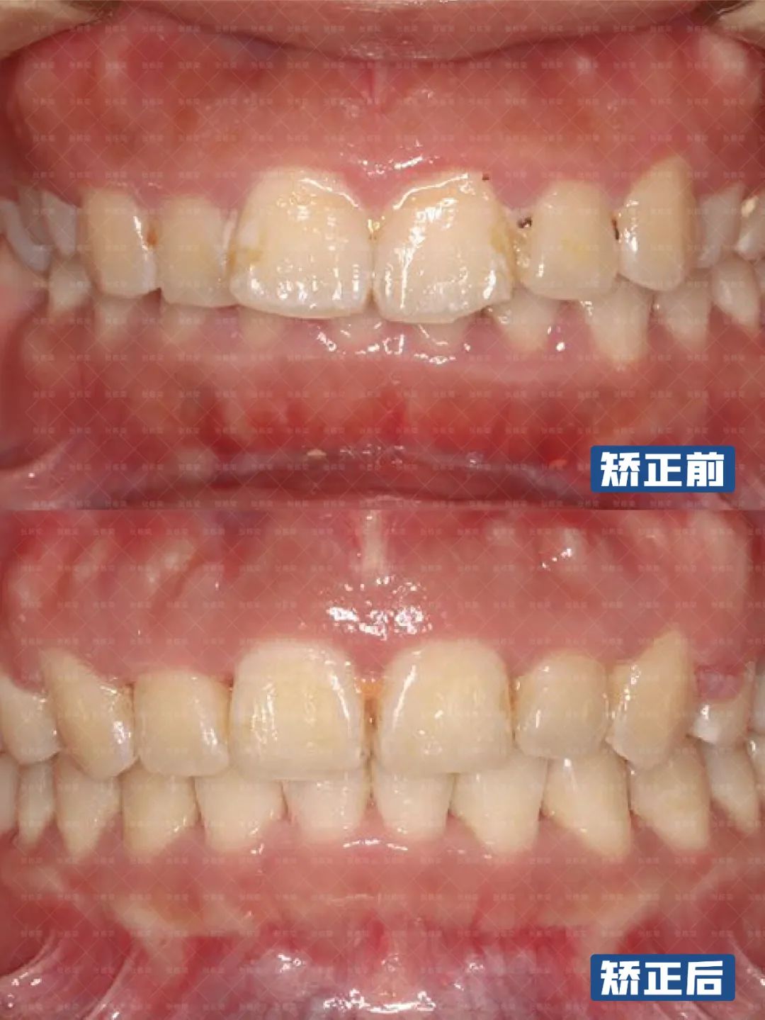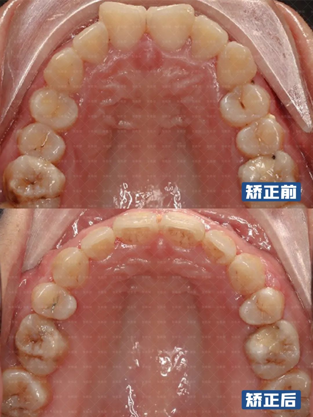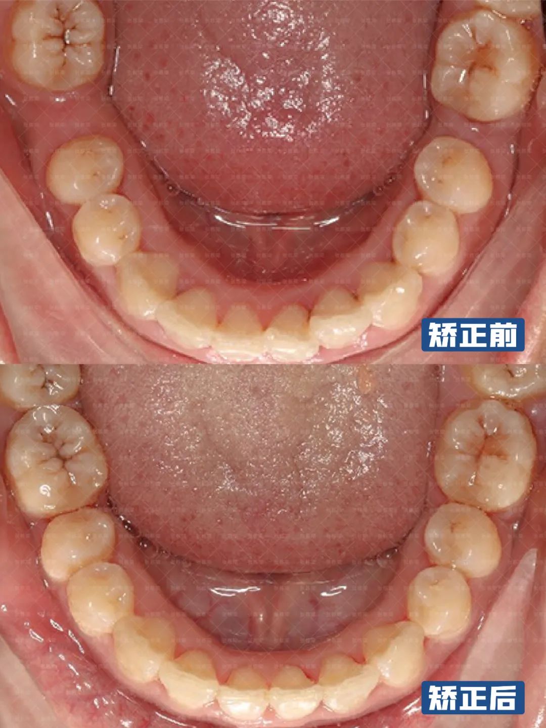 上下前牙转矩角度正常,牙齿排齐,中线对齐,深覆盖解除,颏部形态前伸,上下牙弓匹配,前牙达到正常覆合覆盖,牙齿尖窝关系良好。