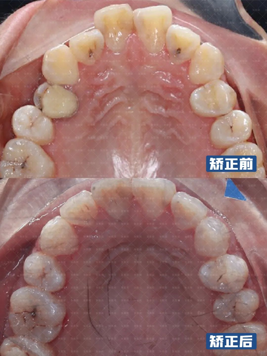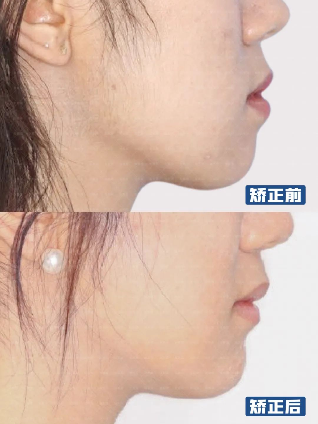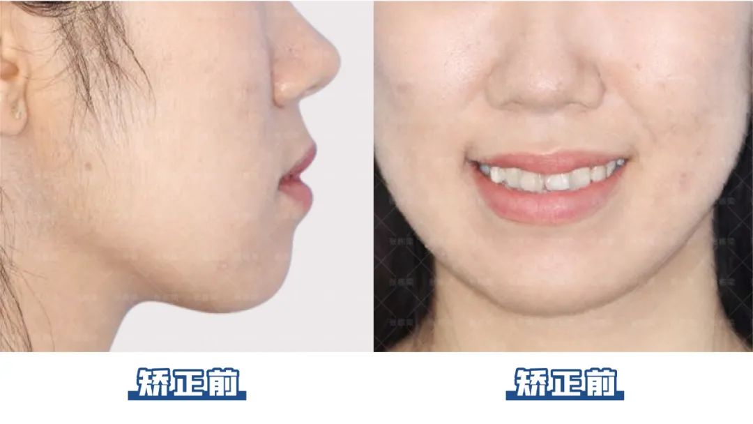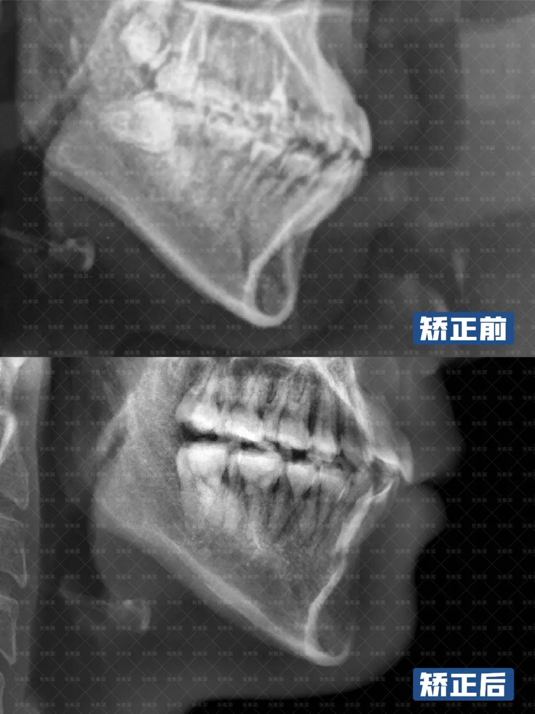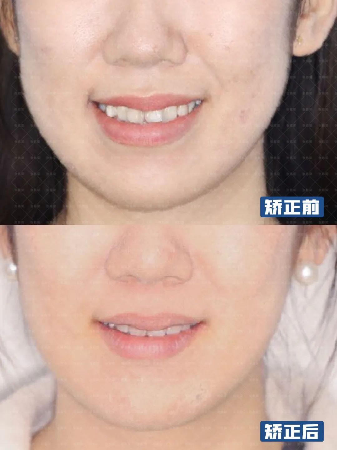 整个牙齿矫正过程,女士配合良好,可以看到上牙转矩角度正常,下前牙直立排齐,嘴凸内收、下巴出来之后,面下三分之一的软组织改善也比较理想。