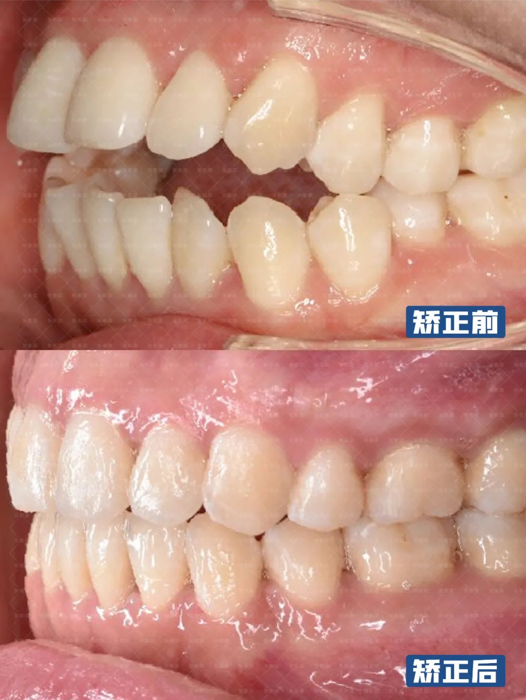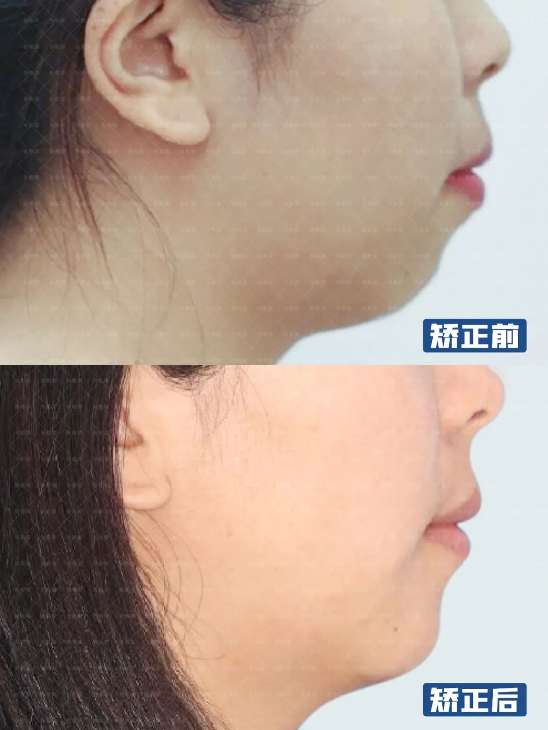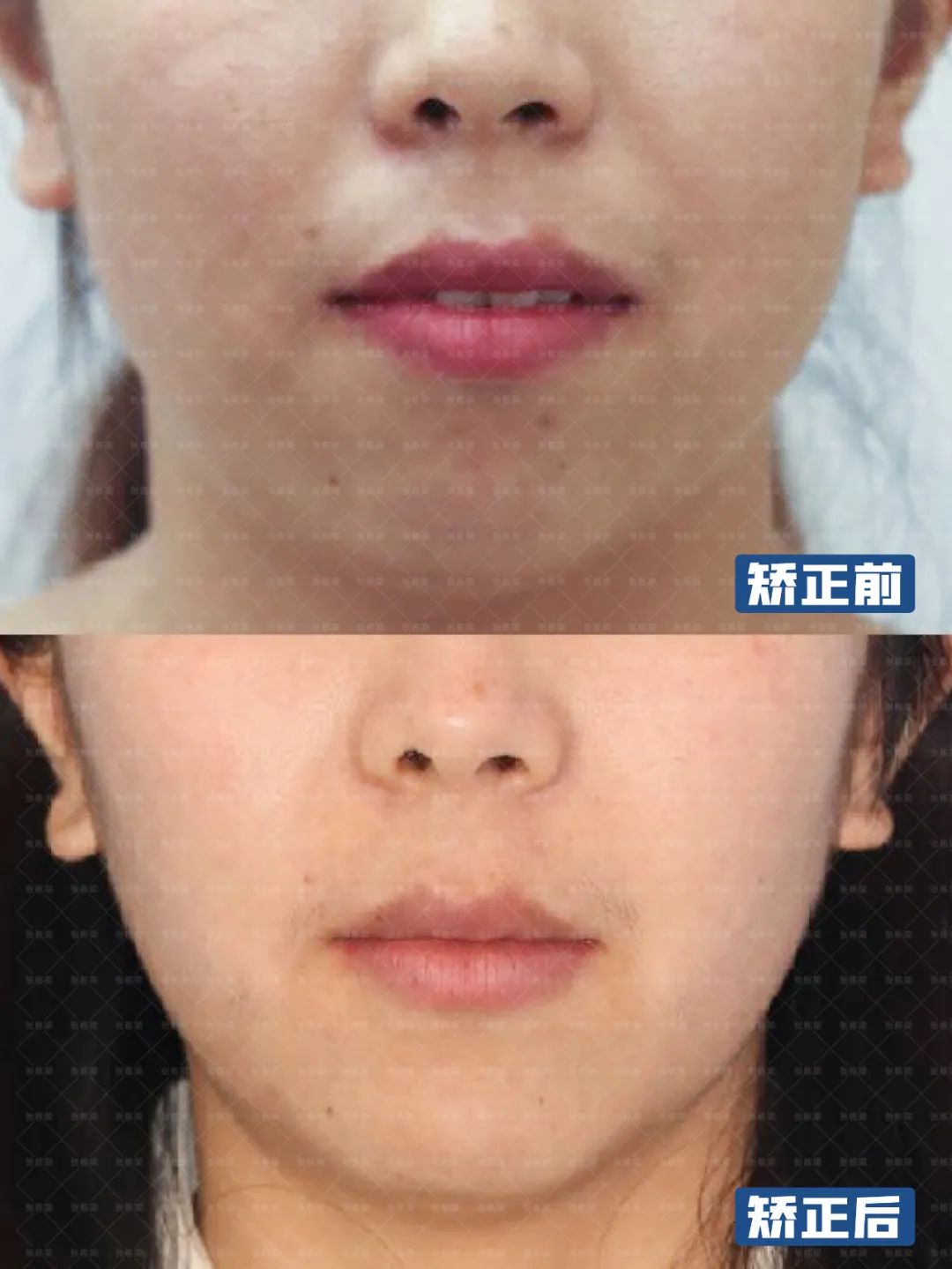 牙齿矫正结束后,从牙齿上看,开颌解除,尖窝关系良好,上下牙弓也恢复协调。从面型上看,下巴前伸,颏肌放松了,面部肌肉轮廓更加协调、放松。
