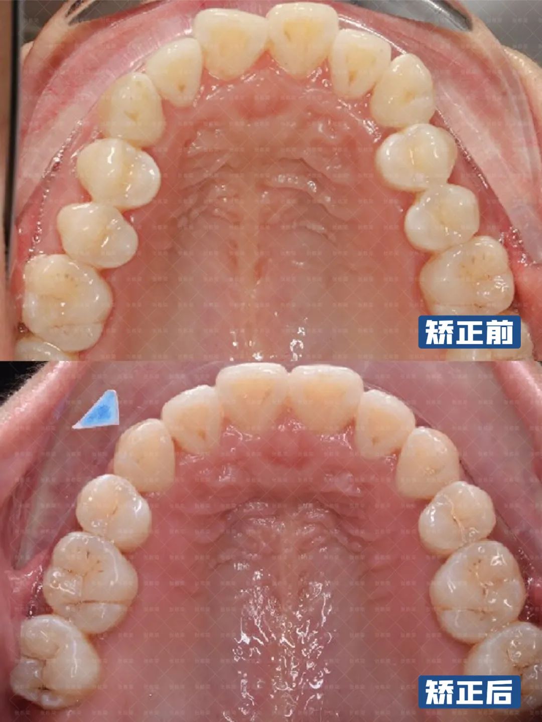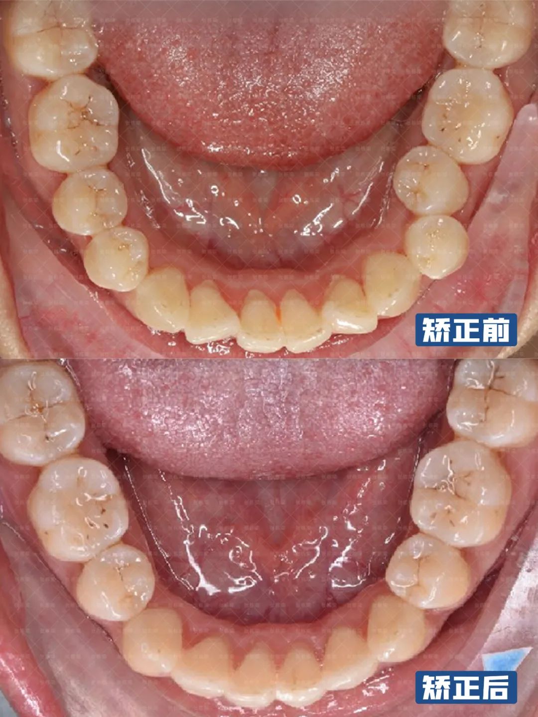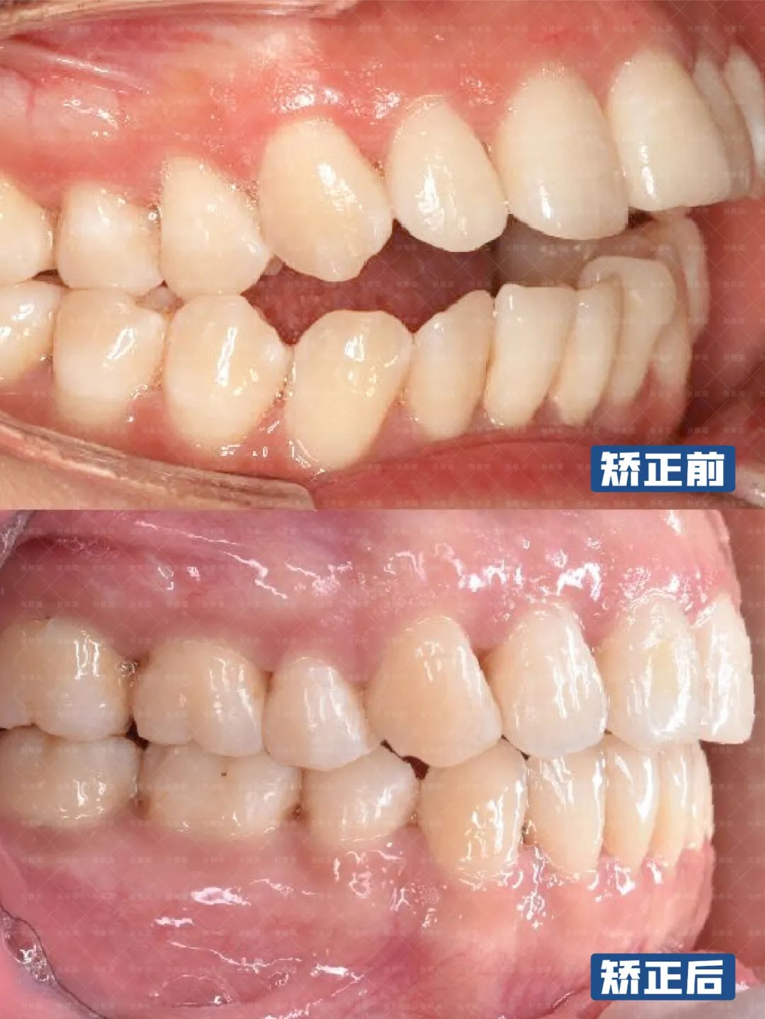牙齿矫正结束后,从牙齿上看,开颌解除,尖窝关系良好,上下牙弓也恢复协调。从面型上看,下巴前伸,颏肌放松了,面部肌肉轮廓更加协调、放松。