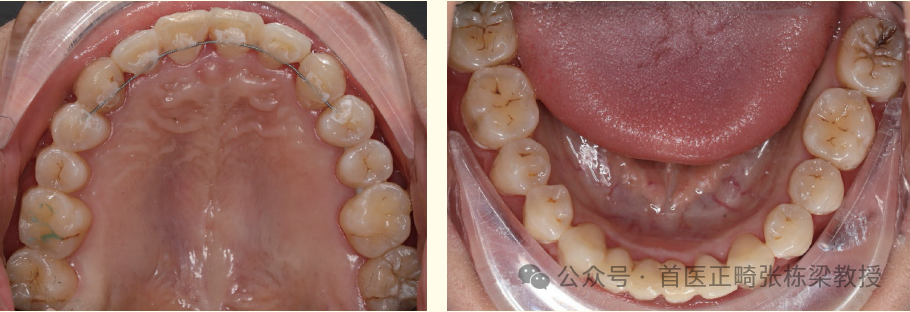 我们使用上下颌种植支抗,远中直立后牙获得间隙,配合必要的片切获得间隙排齐前牙。