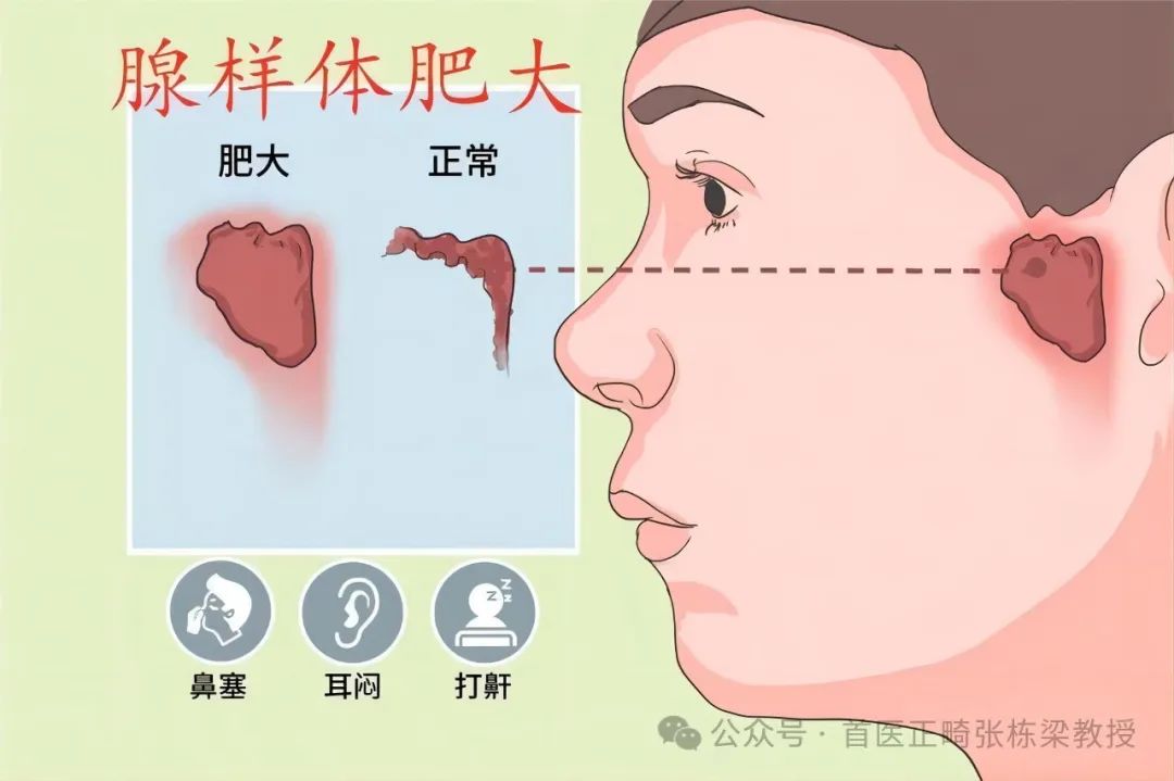 腺样体是位于鼻咽部的一群淋巴组织,当孩子的腺样体因炎症等原因肥大时,会阻塞鼻腔,导致呼吸不畅。