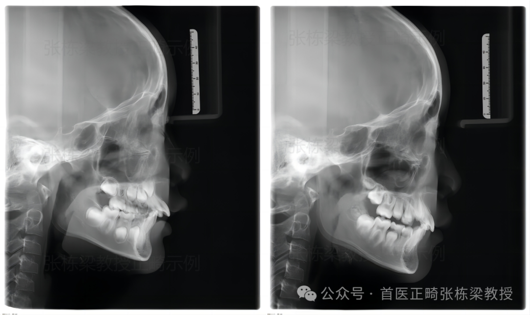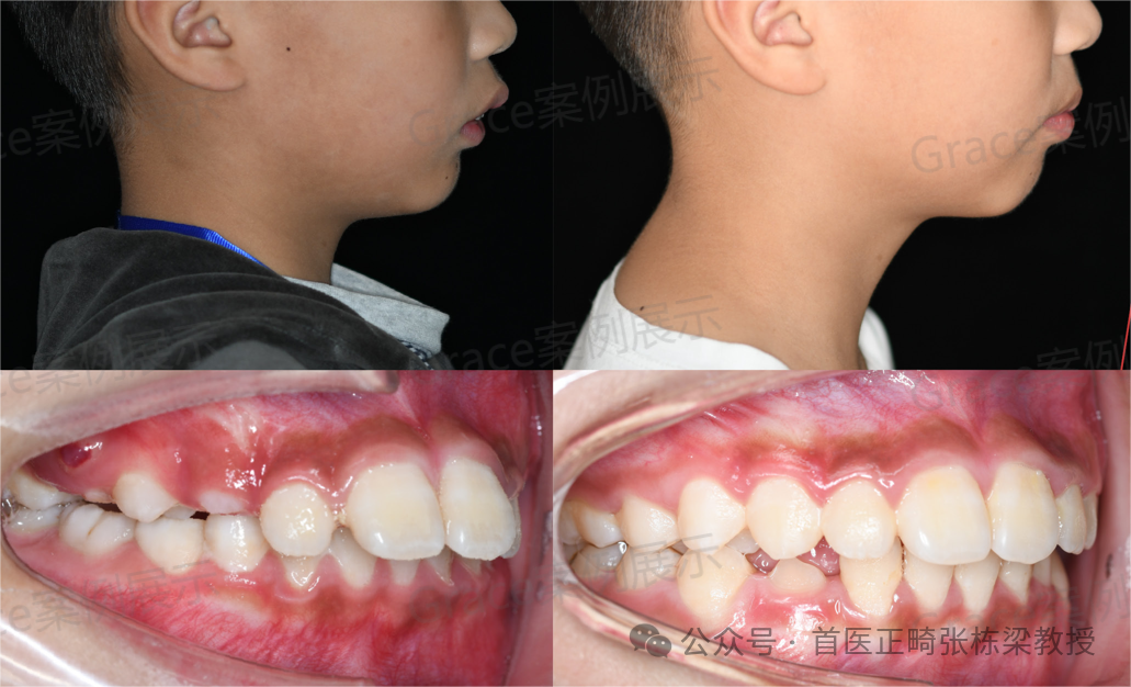 后续增加佩戴口外弓,每天至少 12 小时,为期半年多时间,孩子下颌位置稳定,下颌生长发育限制解除,潜力释放,停戴矫治器,定期复诊,监测孩子后续生长发育。