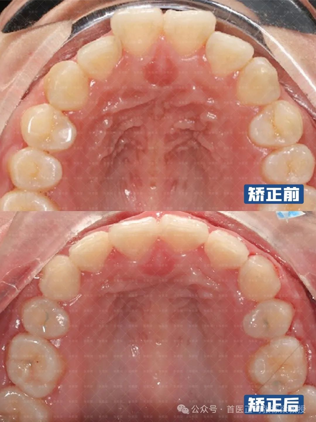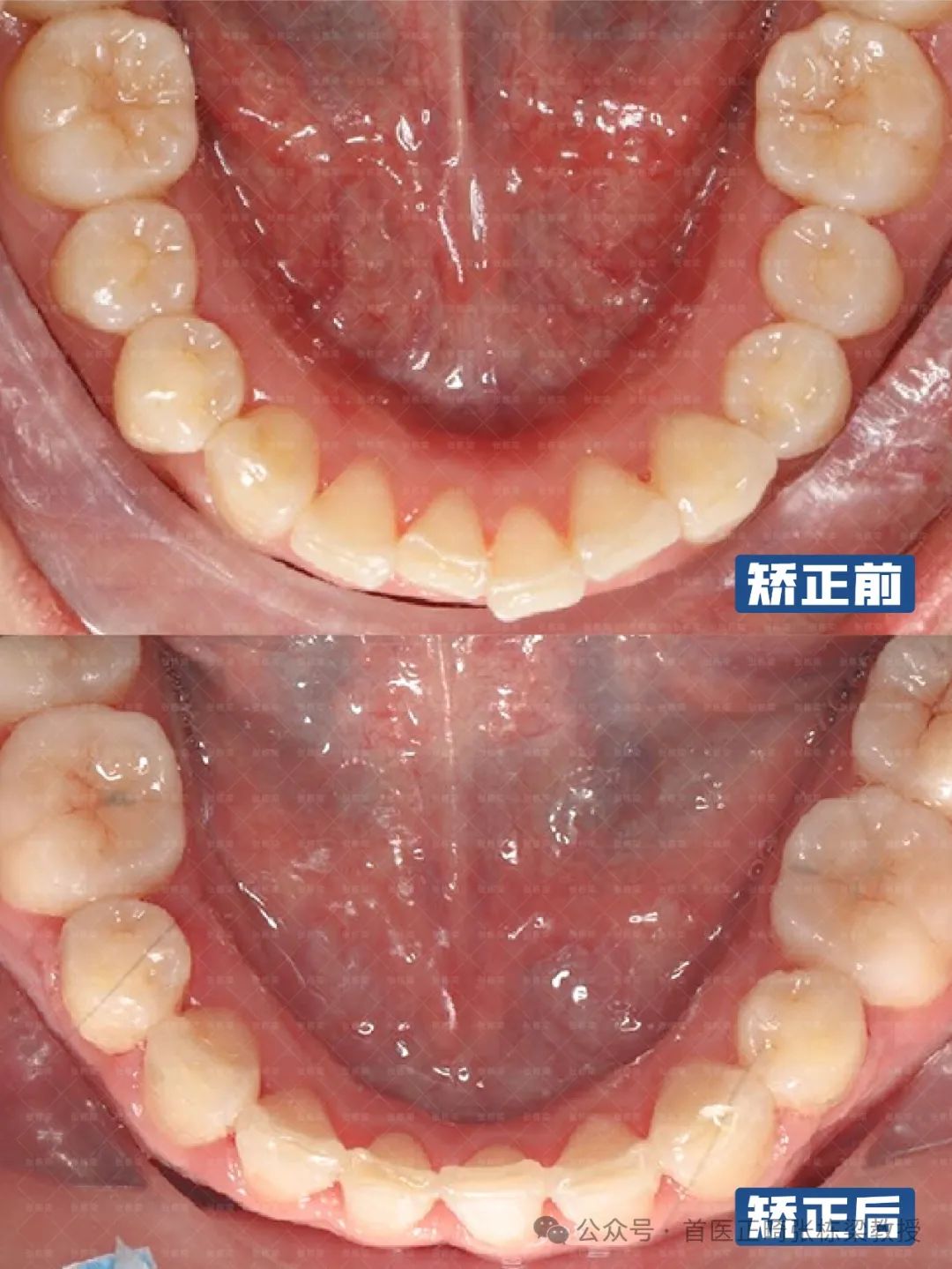 牙列:中线排齐,上下牙列整齐,牙弓卵圆形,上下牙弓匹配,前牙达到正常覆合覆盖,牙齿尖窝关系良好;