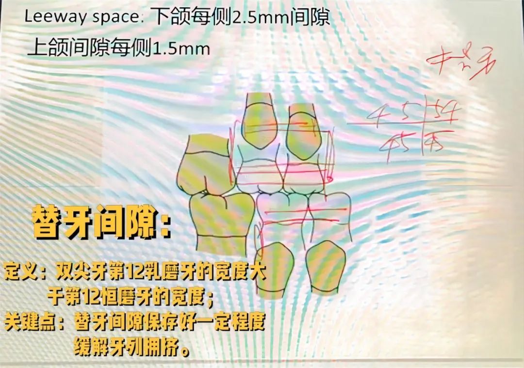 你会发现在孩子的乳磨牙跟里边的恒牙双尖牙,会有一个大小的差异,而乳磨牙都会比恒双尖牙大,那么对于上颌一般是一侧会大2毫米,下颌一侧大概是大2.5毫米。