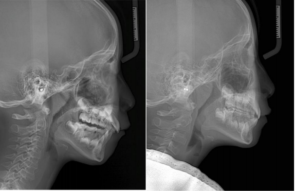 通过牙片资料检查孩子有骨性II类倾向,重度深覆合深覆盖,牙齿存在散在间隙。第一阶段佩戴隐形牙套,隐形矫正结束后,上颌内收,颏部前伸,侧貌形态改善良好,前牙达到正常覆合覆盖。