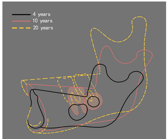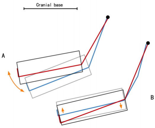 内下颌骨的位置变化很容易被外下颌骨(升支,下颌骨下缘,牙槽突)的改建所掩盖,因此下颌骨的真实旋转和下颌平面旋转并不相同。
