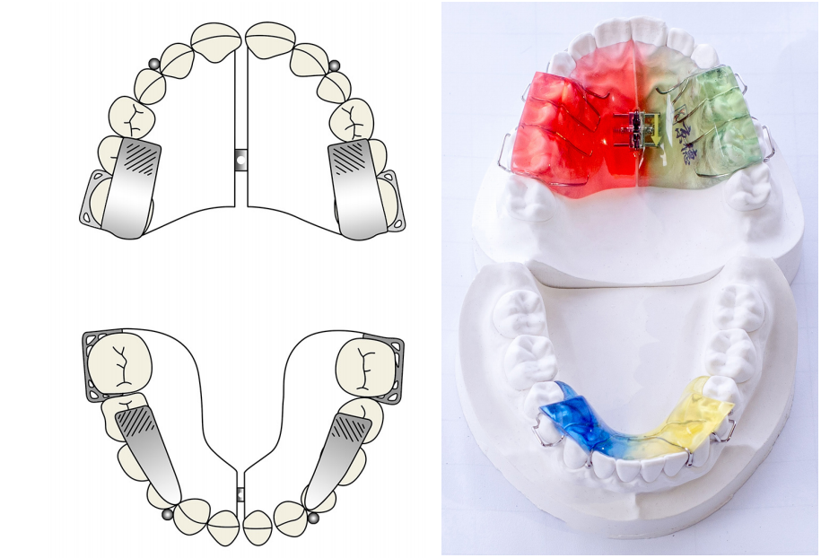 那么替牙期引导下颌向前的方法其实比较多,我们常用的有2x4口外弓、Twin Block、斜导工具、隐形牙套+II类颌间牵引、Activitor肌激动器、FrankelⅡ等。