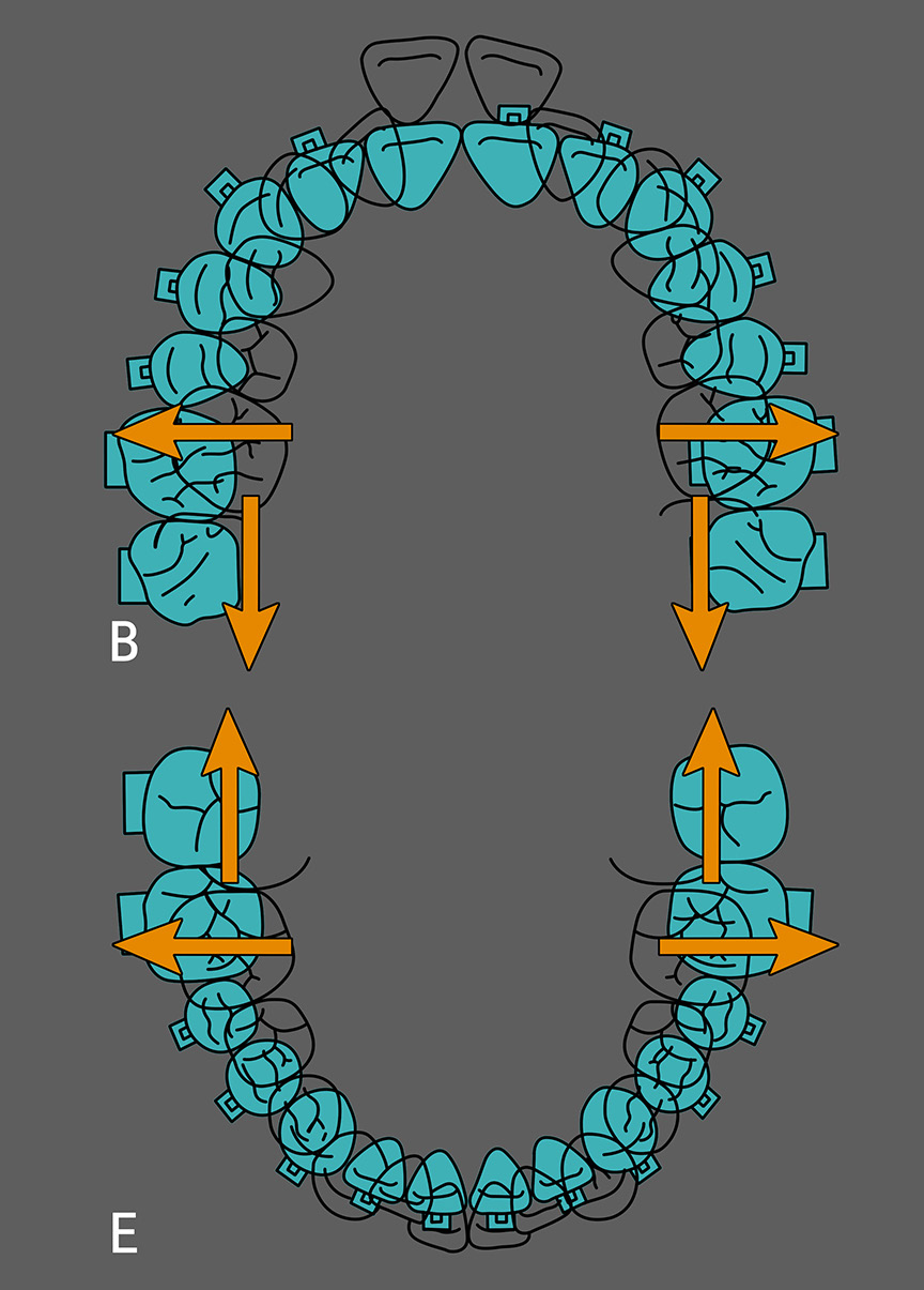 因此我所遇到的这些早期矫治的案例,好像有很大一部分,其实是不需要扩弓的。只有像 II 类患者或者孩子前伸下颌至目标位时,侧方牙弓出现覆盖过小,甚至反颌的情况,可以考虑扩弓。