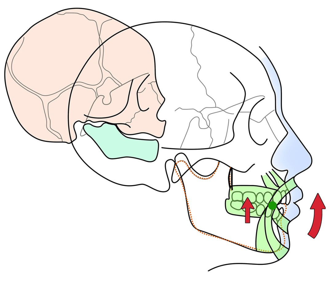那么颌板把这个收缩的力量就传导到牙齿,就会对上下磨牙产生压入的力量,抑制后牙萌出,如此保存上下颌差异性生长产生的颌间间隙,颌间间隙能够促进下颌逆时针旋转,下颌颏部前移。