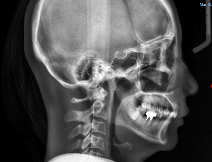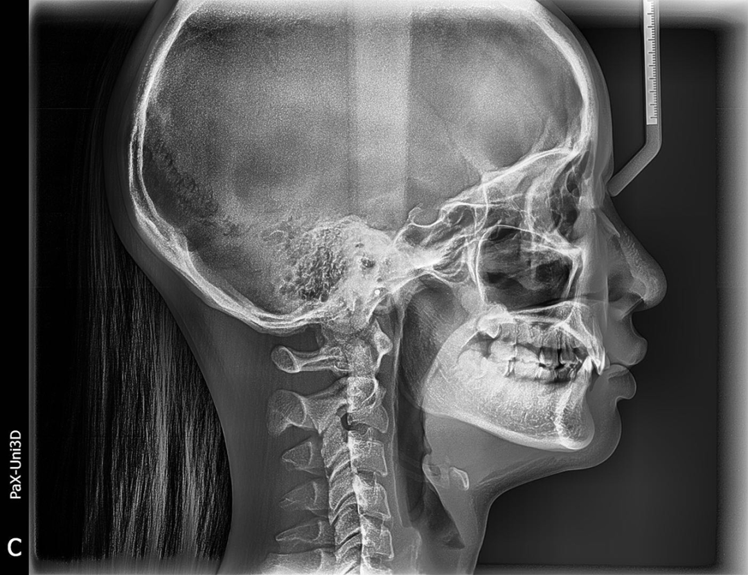 通过牙片资料可以看到女士是闭锁性深覆合,上牙几乎把下牙完全盖住,整个咬合关系并不是很理想,从侧貌看,她的下嘴唇相对靠后,下巴有点后缩,颏唇沟很深。