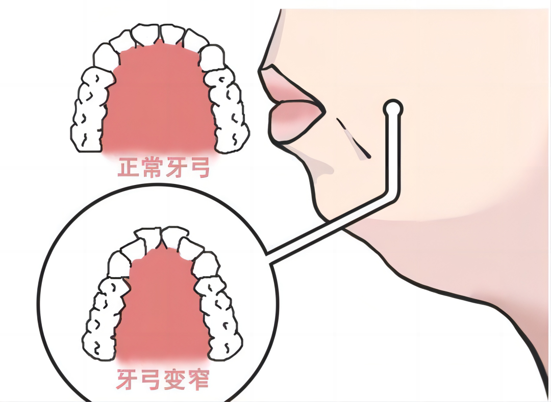 当孩子习惯性口呼吸时,舌体置于下颌牙列,造成口腔内外肌力失衡,不仅可能造成上颌牙弓狭窄,且狭窄的牙弓无法容纳正常宽度的下牙弓形成正常颌位,阻碍了下颌向前生长发育的潜力空间,容易出现下巴后缩。
