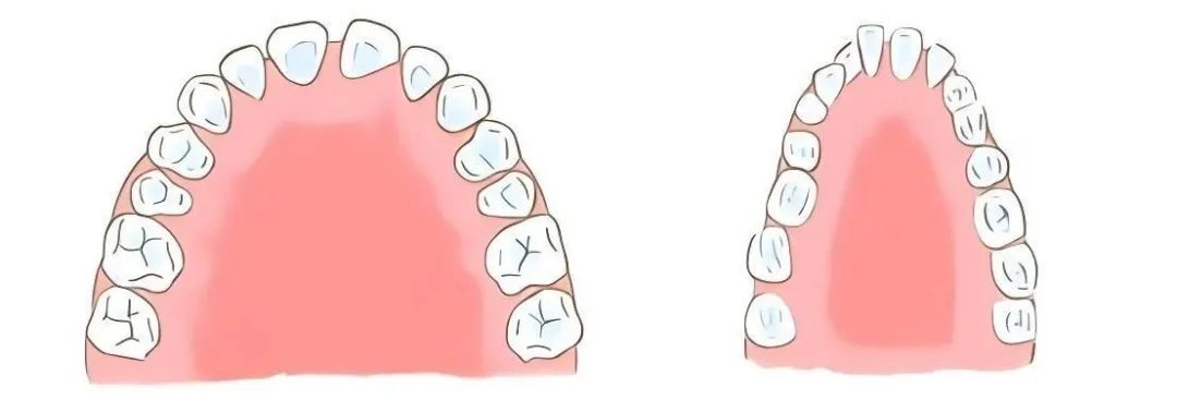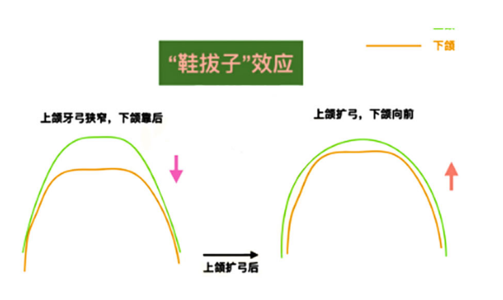 那么上颌牙弓窄就相当于我们穿一双小鞋,这个时候脚没地放,脚一定是向后退的,因此由于咬合关系的影响,牙弓狭窄就会导致下颌后缩。