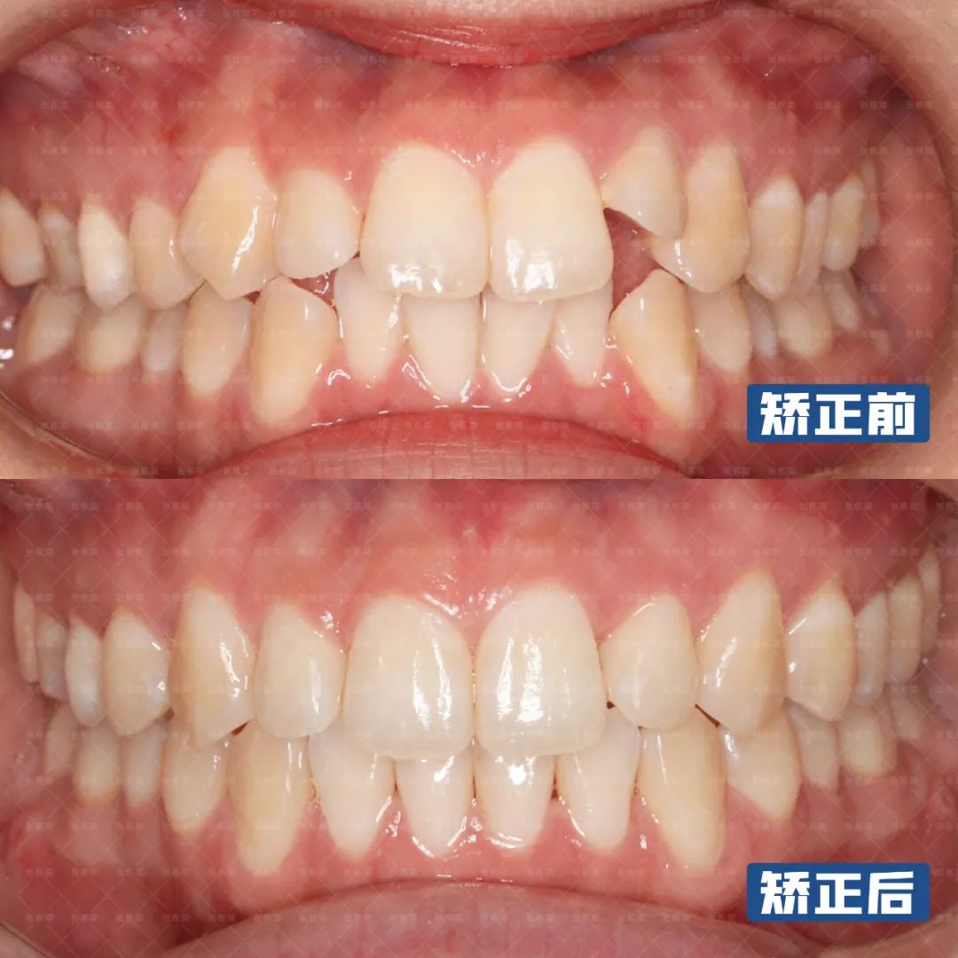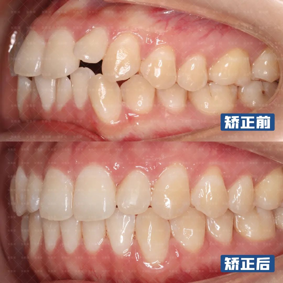 整个治疗过程,女士配合良好,牙齿矫正结束可见上牙转矩角度正常,牙齿直立排齐,鼻、唇、颏部协调,唇部状态和咬合关系也更佳,咬合关系和下巴位置的调整,也一定程度上减轻了关节的压力。正畸医生在矫正过程中所做的,不仅是内收排齐牙齿,对转矩的控制、对垂直向高度的控制,都要严格监控并实施到位。
