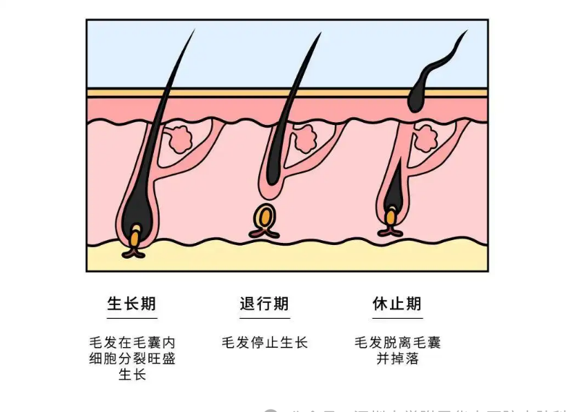 休止期:头发渐渐步入了“毛”生尽头,大概2-3个月后,就会跟毛囊小窝say byebye了。在头发脱落之后,下一个毛发就会在这个毛囊小窝里重生,进入下一个毛发周期。