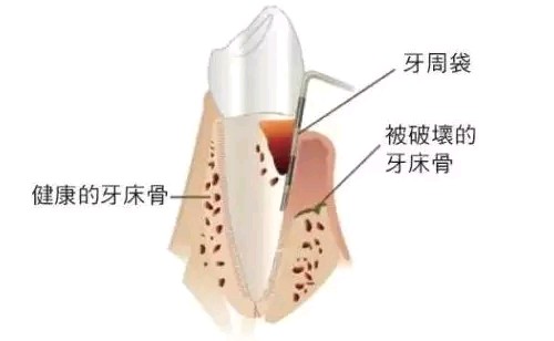 如果牙龈炎不及时治疗,炎症就会朝着牙齿根部发展,形成牙周袋(下图中带尺度的小棍是用来探查牙周袋深度的)。细菌在牙周袋内繁殖,对牙齿造成更多的损伤,它会引起牙齿支持组织(牙槽骨)的炎症和吸收,最后导致牙齿松动。