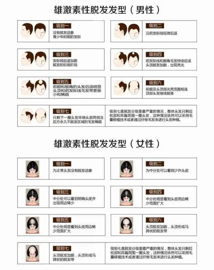 在所有的脱发类型中,雄激素源性脱发是最常见的,这种脱发也称脂溢性脱发和遗传性脱发,占所有脱发类型的90%以上,男女均会发生,但男性发病率高于女性。