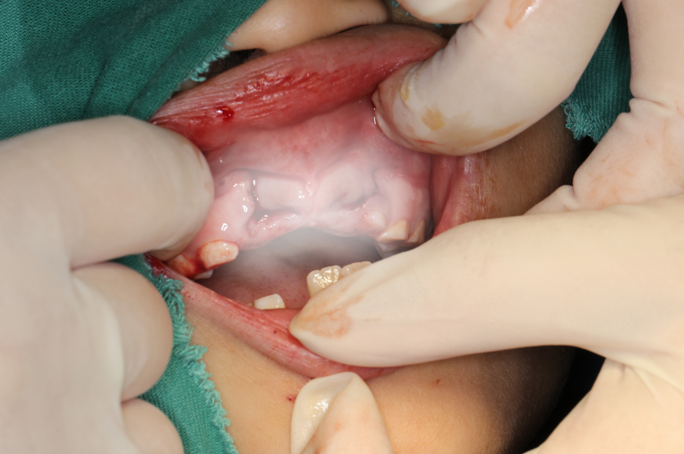 在治疗过程中,我先为患儿先进行牙槽骨复位+11、21号恒牙再植+术后牙周钢丝+树脂纤维带固定,同时对上颌牙列进行颌垫保护。