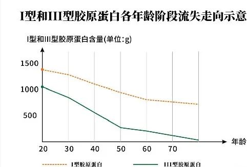 而所有肌肤衰老归结到组织结构的变化,就是人体胶原蛋白的流失,肌肤中的胶原蛋白主要分为两种:I型和III型。随着年龄增长,I型和III型急剧减少,维持肌肤弹性、润泽、韧性的III型胶原蛋白比例骤减。