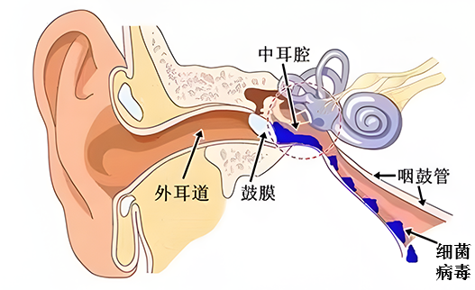 当我们发生感冒、流感等疾病时,鼻腔或鼻窦内的细菌或病毒会沿着咽鼓管进入中耳。咽鼓管是一个细长的管道,它从中耳连接到鼻腔,能够调节中耳气压,排出中耳的正常分泌物。
