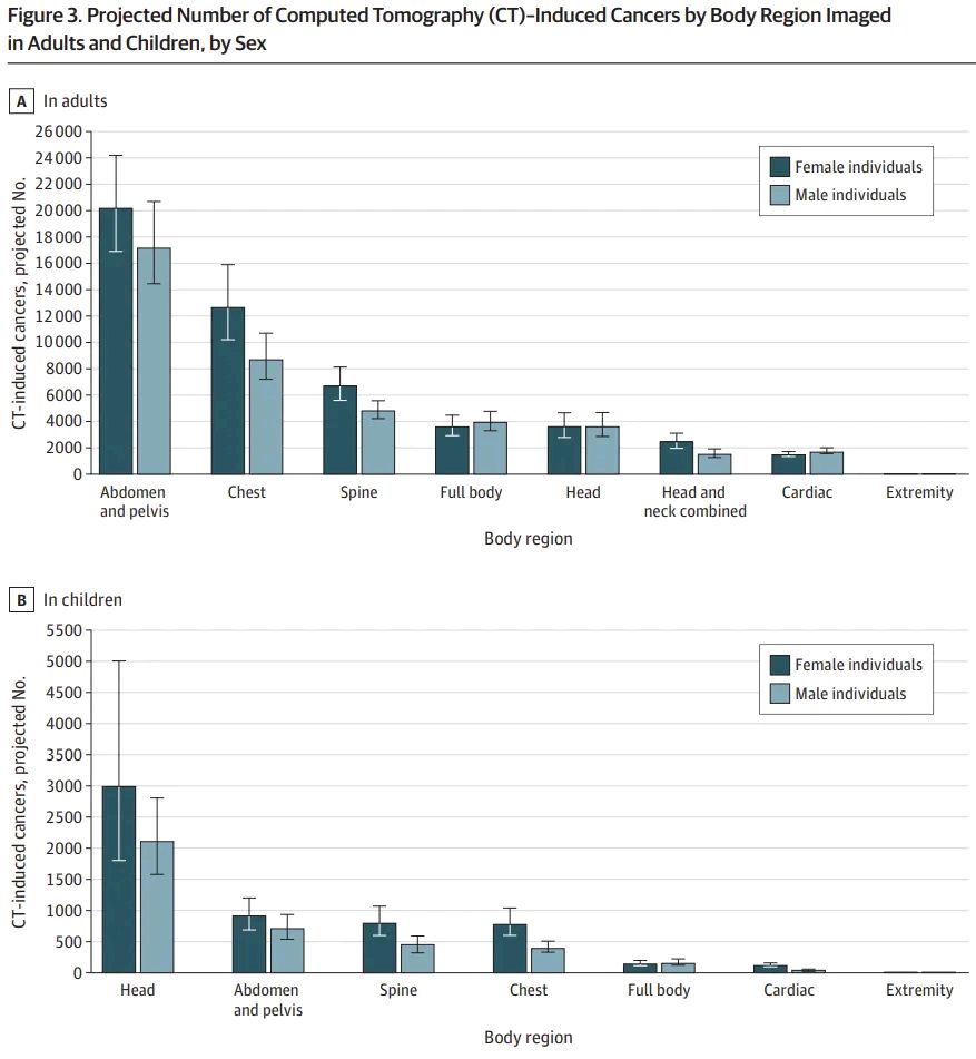 而根据 CT 检查的部位分层,成人的 CT 相关癌症主要由腹部和盆腔的 CT 引起,儿童主要由头部 CT 引起。