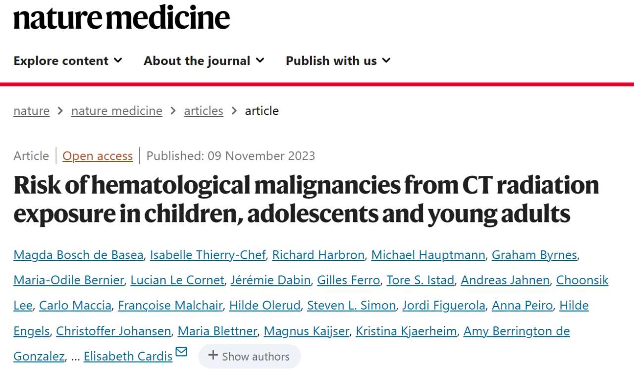 例如,2023 年,Nature Medicine 就刊载了一项研究,分析了年轻人 CT 检查与血液系统恶性肿瘤发病风险之间的关联。研究人员对 9 个欧洲国家的 948,174 名 22 岁前接受 CT 检查的年轻人进行了随访,最后得出的结论为:每 10,000 名接受 CT 检查的儿童里,在预计未来 12 年内,将有 1~2 人患上 CT 相关的血液系统恶性肿瘤。[3]